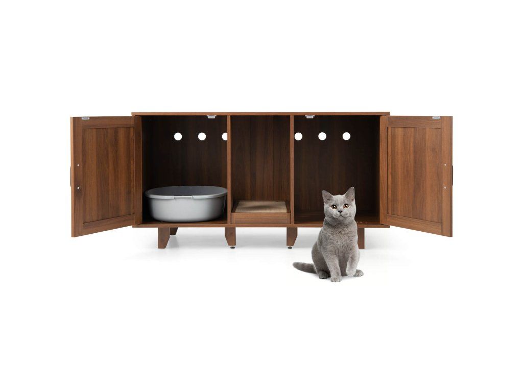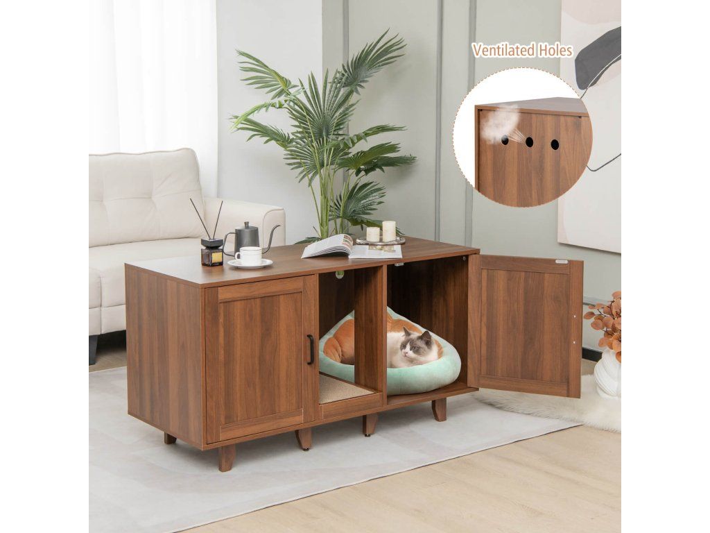 2-Door Cat Litter Box Enclosure with Winding Entry and Scratching Board-Brown