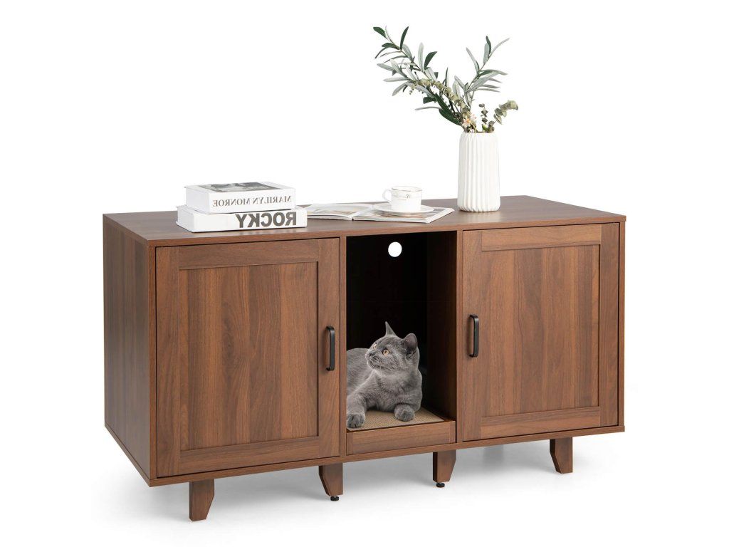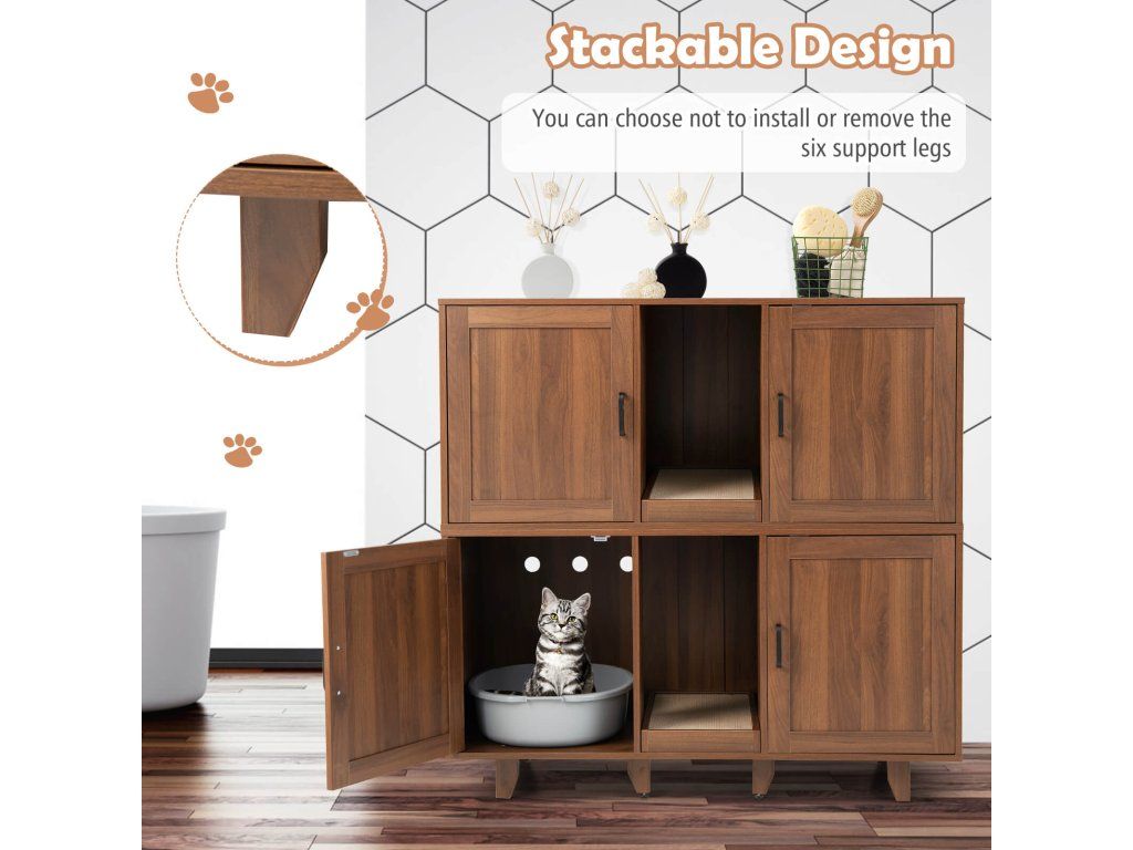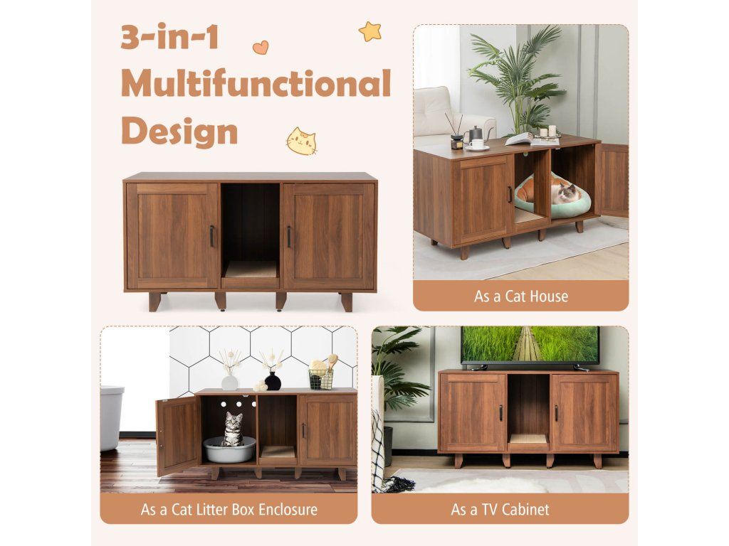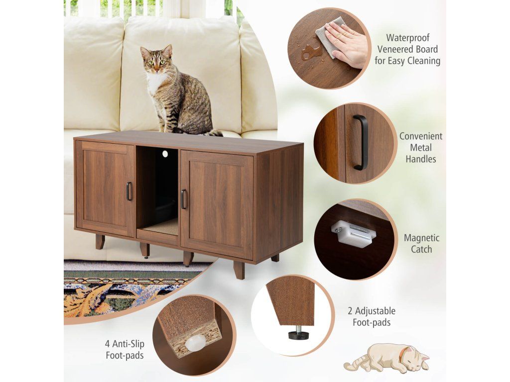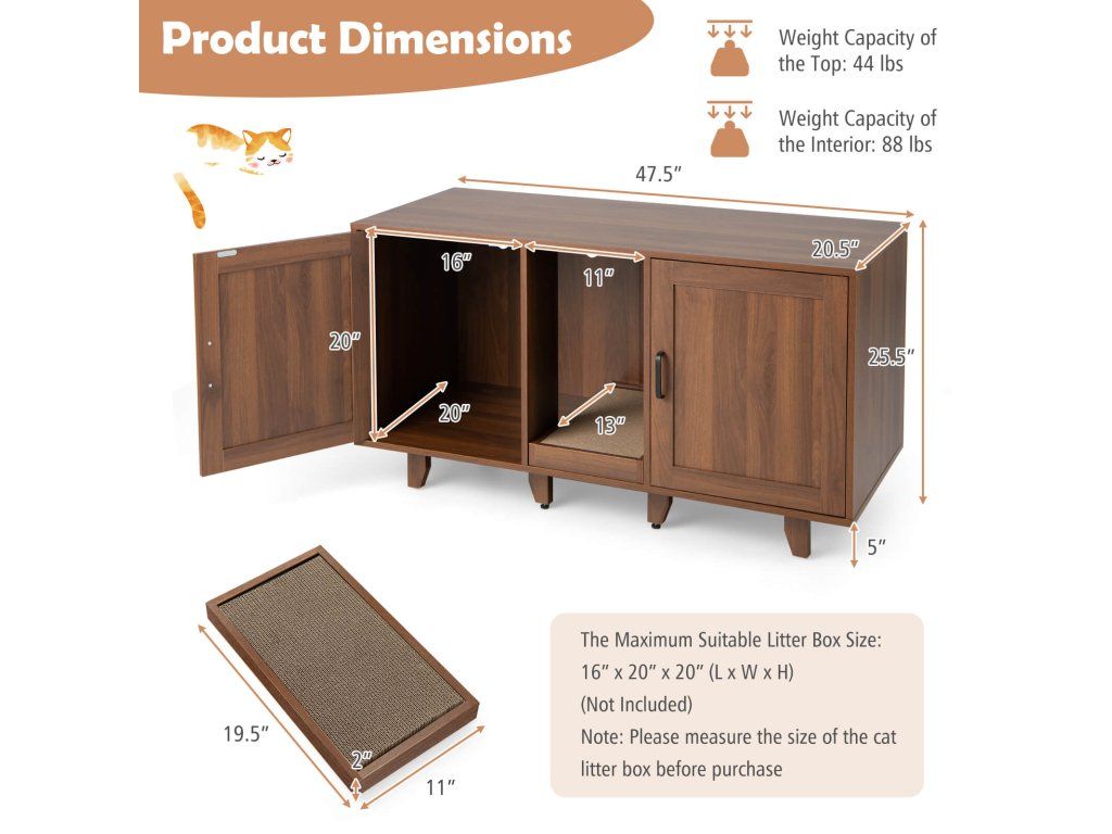-The enclosed design creates a private and safe spot for your cats to go potty -Can also be used as a place for cats to sleep and play or as a TV stand or side table-The spacious tabletop for placing magazines, plants, decorations, etc-The winding entry allows your cat to walk in and walk out with ease-The cat scratching pad meets cats' natural needs while protecting your furniture-Magnetic catches keep doors closed tightly, avoiding unwanted open-Multiple ventilated holes bring you an odorless and fresh home-Anti-slip & adjustable foot pads prevent your floor and enhance stability-Thick boards are scratch-resistant, durable and easy to clean-Modern style adds a touch of elegance to your home -Easy to assemble with detailed instructionBuďte první, kdo napíše příspěvek k této položce.