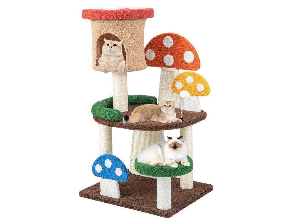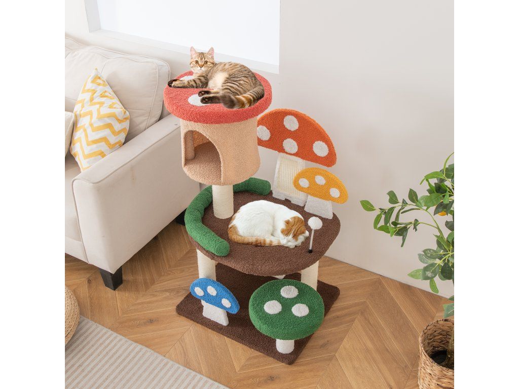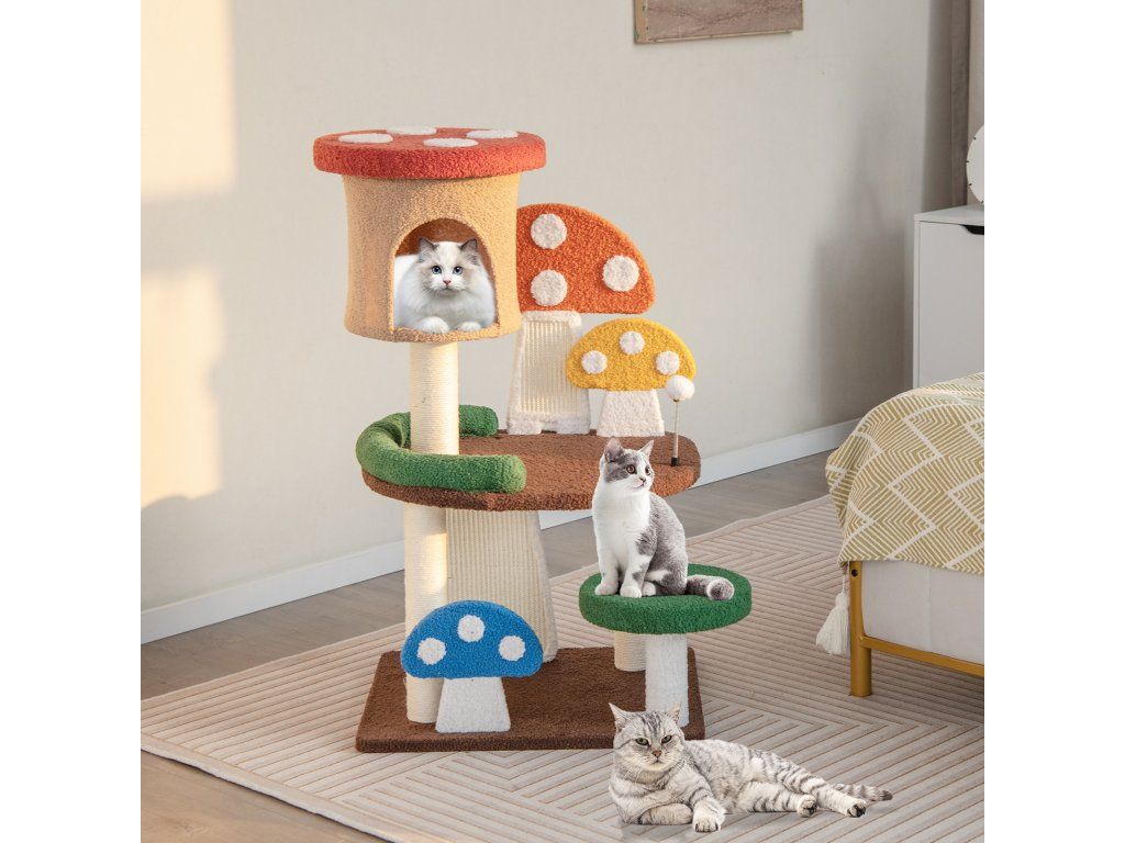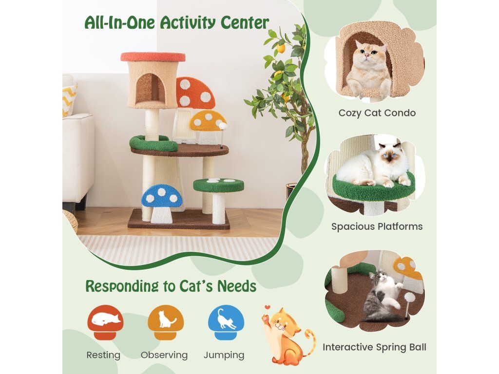 -All-in-one activity center with a cozy cat condo, spacious platforms and a spring ball-Perfectly responding to cat's needs, including resting, observing, jumping, and more-Full-wrapped sisal post and scratching boards to satisfy kittens' scratching needs-As a great present from nature, its all-natural sisal rope is much safer-Teddy fabric and sponge padding to offer a warm and fuzzy feeling for cats-Multi-layer park with a scientific layout to balance endless fun and exercise-Designed with protective edges to avoid accidental scratches for higher security-Better stability is well ensured by the enlarged base, without tipping over-Has many lovely mushrooms that will attract your cats' attention at first sightBuďte první, kdo napíše příspěvek k této položce.