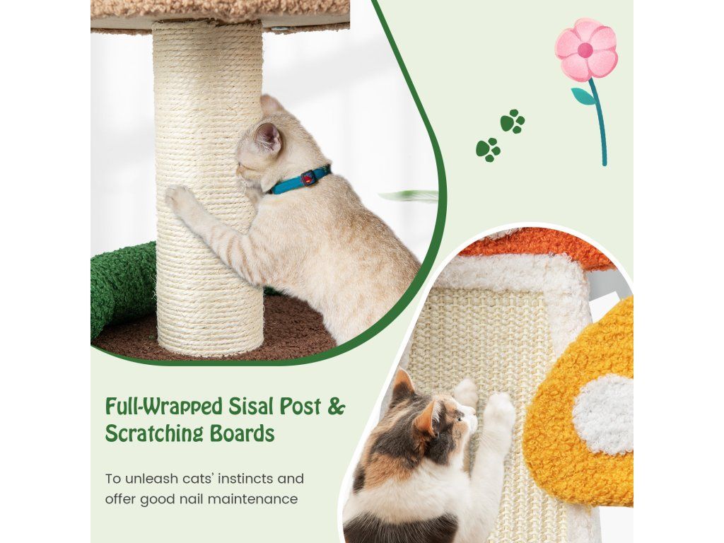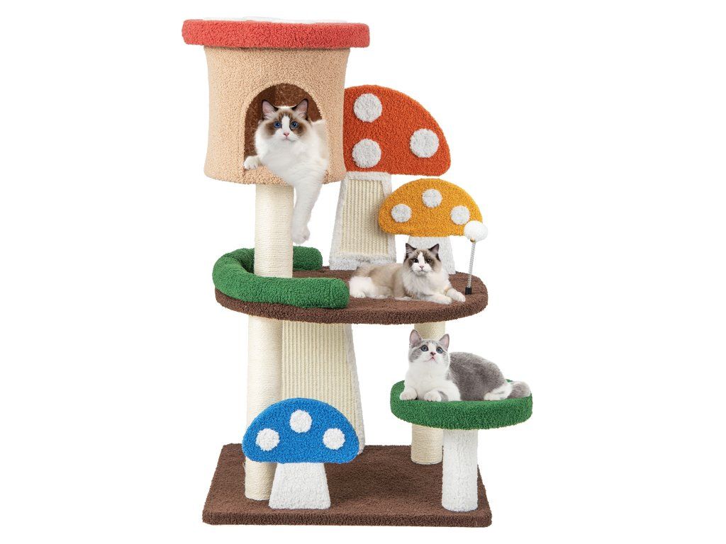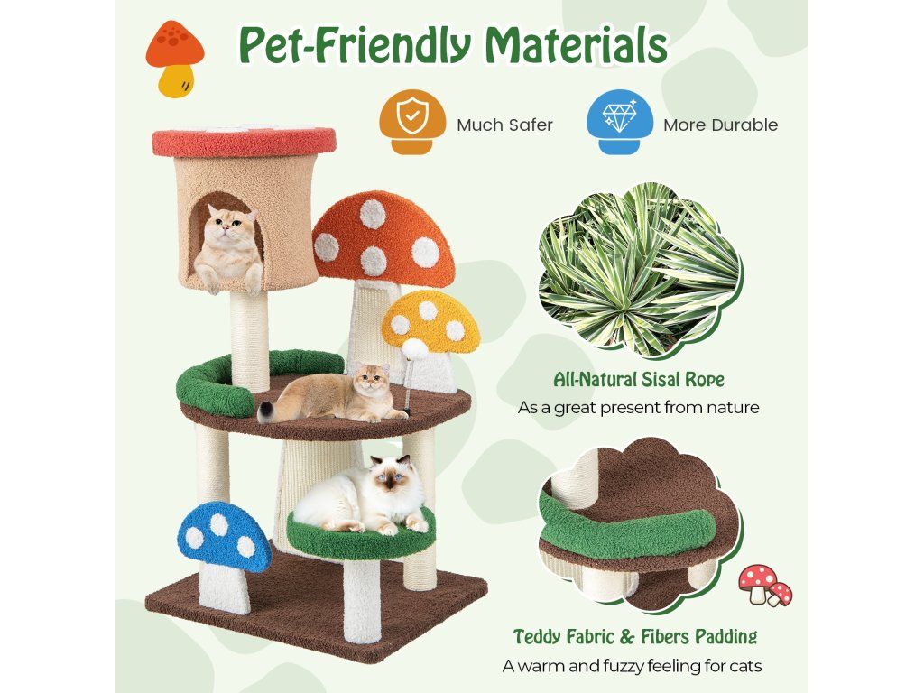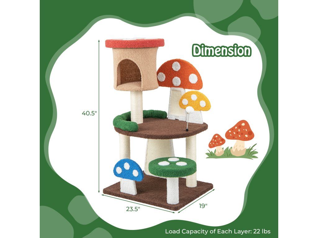 -All-in-one activity center with a cozy cat condo, spacious platforms and a spring ball-Perfectly responding to cat's needs, including resting, observing, jumping, and more-Full-wrapped sisal post and scratching boards to satisfy kittens' scratching needs-As a great present from nature, its all-natural sisal rope is much safer-Teddy fabric and sponge padding to offer a warm and fuzzy feeling for cats-Multi-layer park with a scientific layout to balance endless fun and exercise-Designed with protective edges to avoid accidental scratches for higher security-Better stability is well ensured by the enlarged base, without tipping over-Has many lovely mushrooms that will attract your cats' attention at first sightBuďte první, kdo napíše příspěvek k této položce.