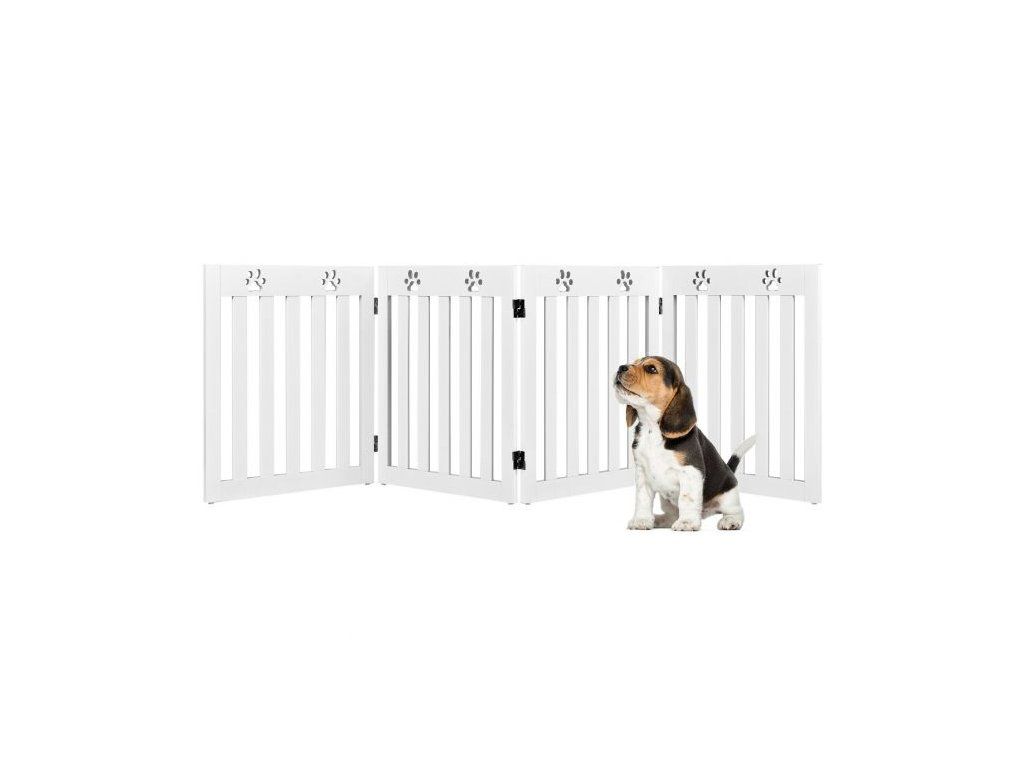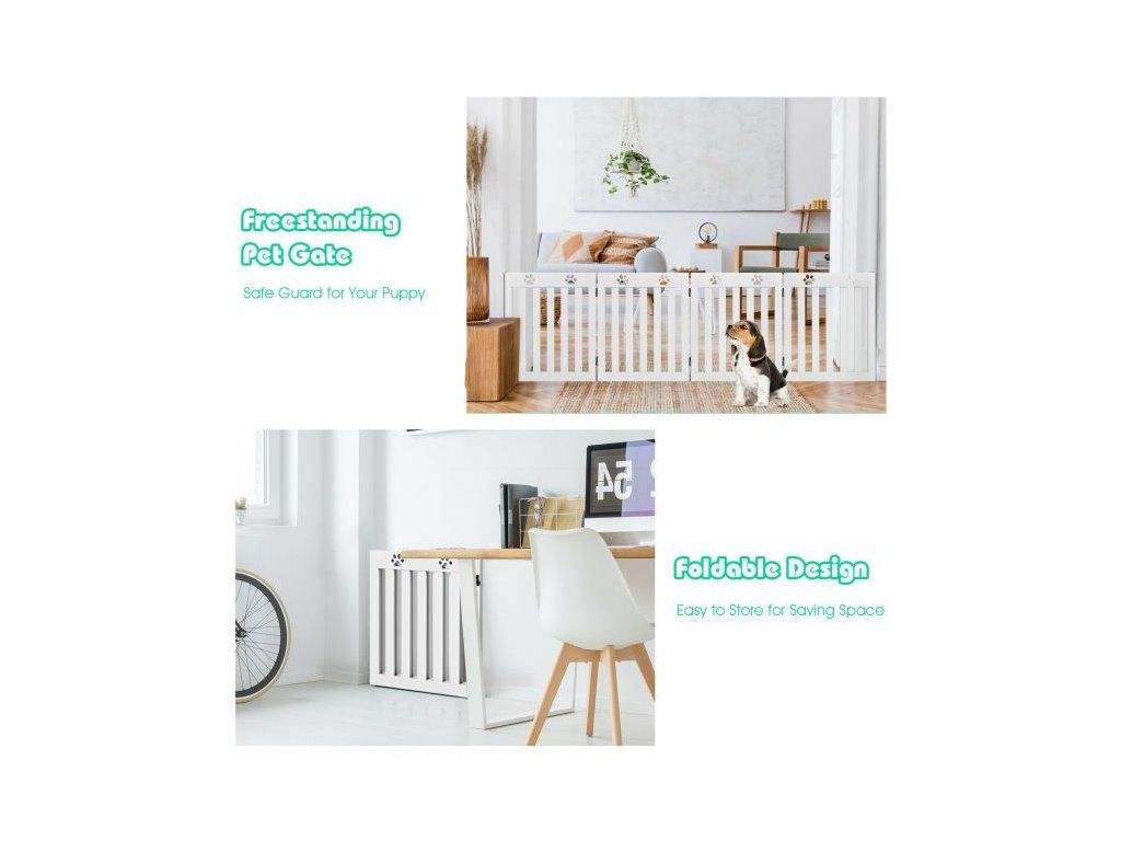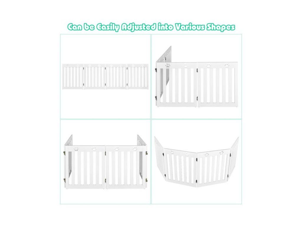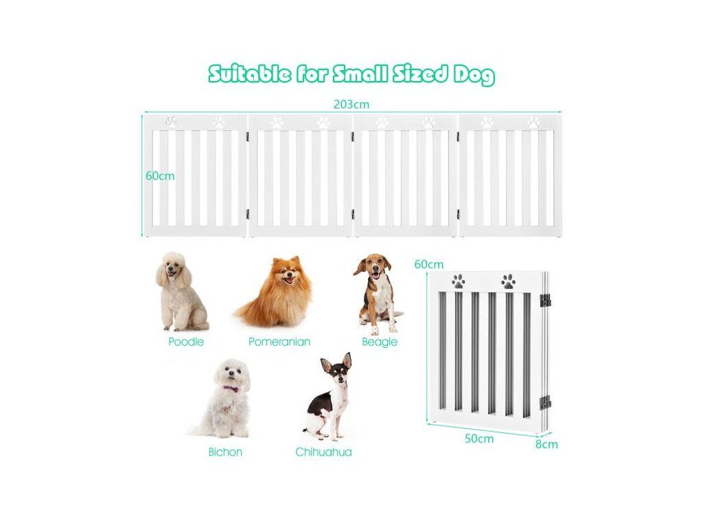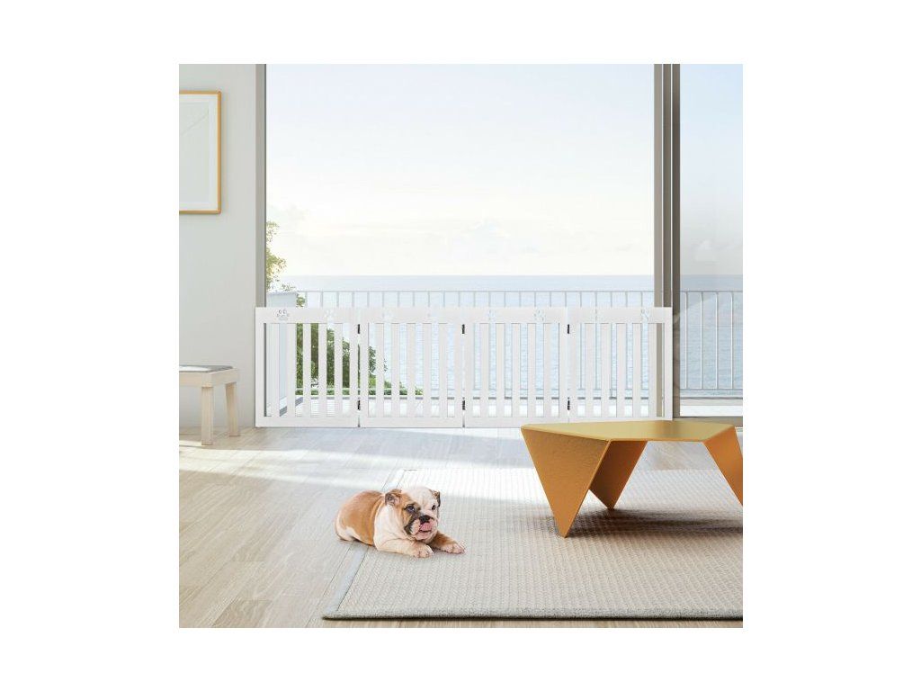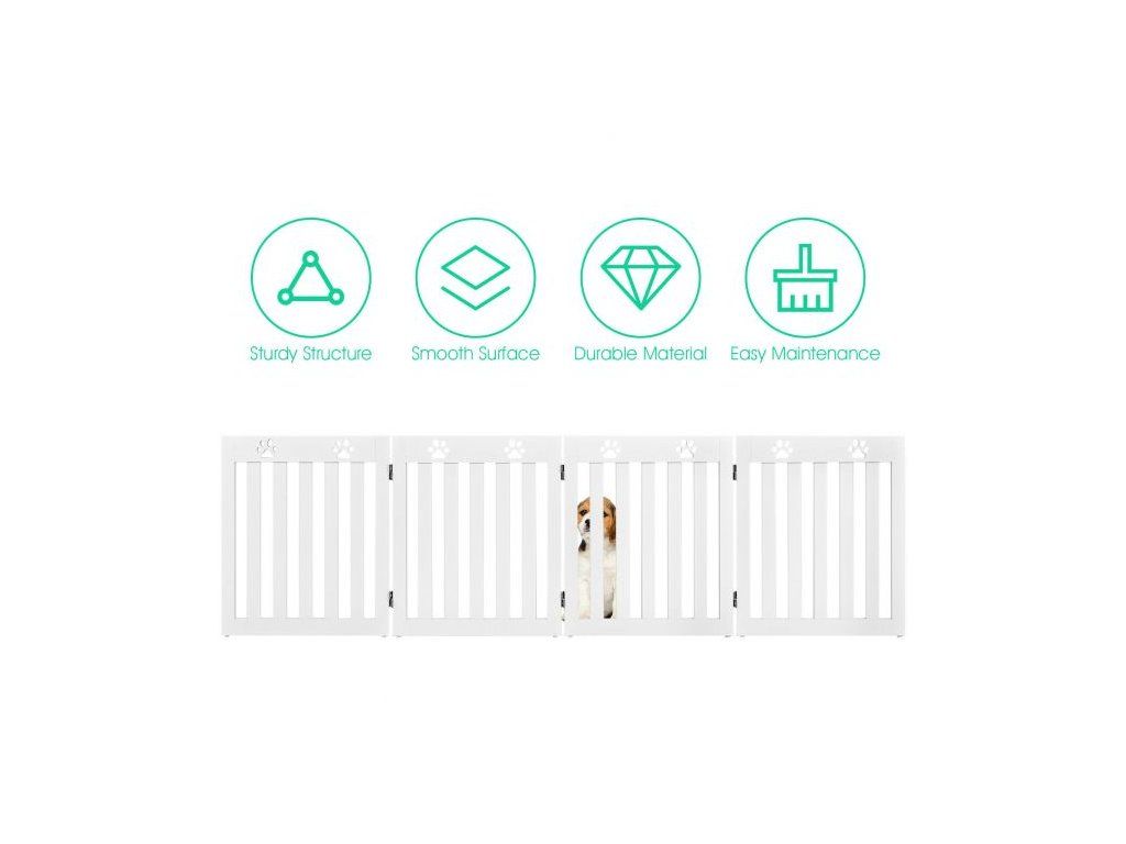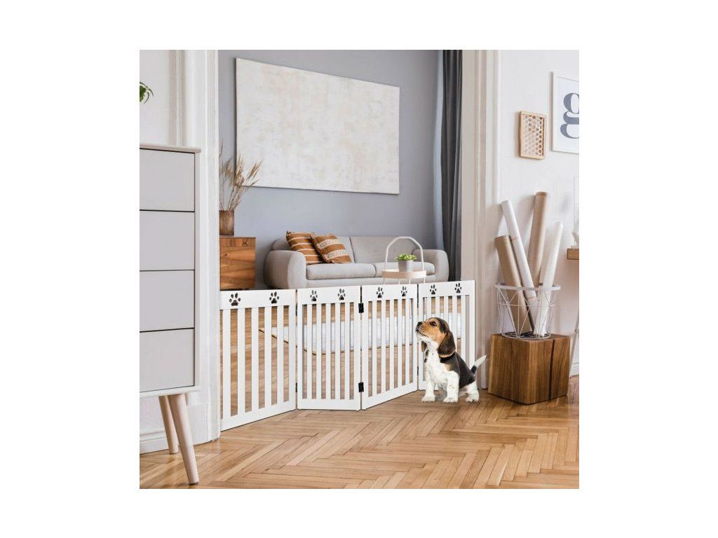 Specially designed for your four-legged friends, this 4-panel pet gate is designed to stop your dog from going places you don't want them to. Designed to stop your pet from entering a space they shouldn't, the gate has decorative paw cut-outs on the top of each panel. The spacing between the slats, allows you to watch your pet but are too small for your dog to climb through. The gate is freestanding and can be folded in four to create a smaller gate. Anti-slip foot pads are on the bottom of each panel adding stability and the gate has been covered with a non-toxic waterproof stain. Suitable to be used in doorways, the bottom of the stairs, or as a barrier in front of a bookcase or shoe rack etc. Easy to assemble following the instructions provided. The stylish, practical design suits any home décor. Safety gate for your four-legged friend Freestanding; the gate does not need to be attached to a wall Suitable for various sized doorways, stairs etc., due to its folding properties Easy to move and store. Appropriate height for preventing smaller breeds of dog from jumping over Quality MDF used suitable for daily use Coated with a waterproof stain needing no maintenanceBuďte první, kdo napíše příspěvek k této položce.