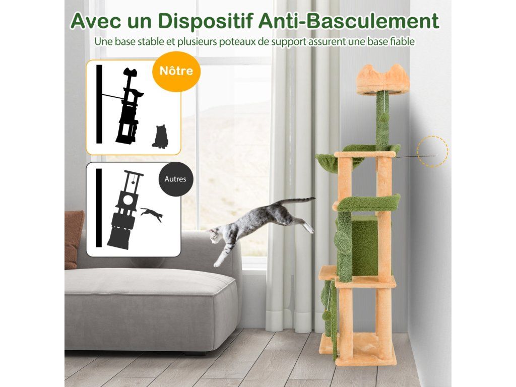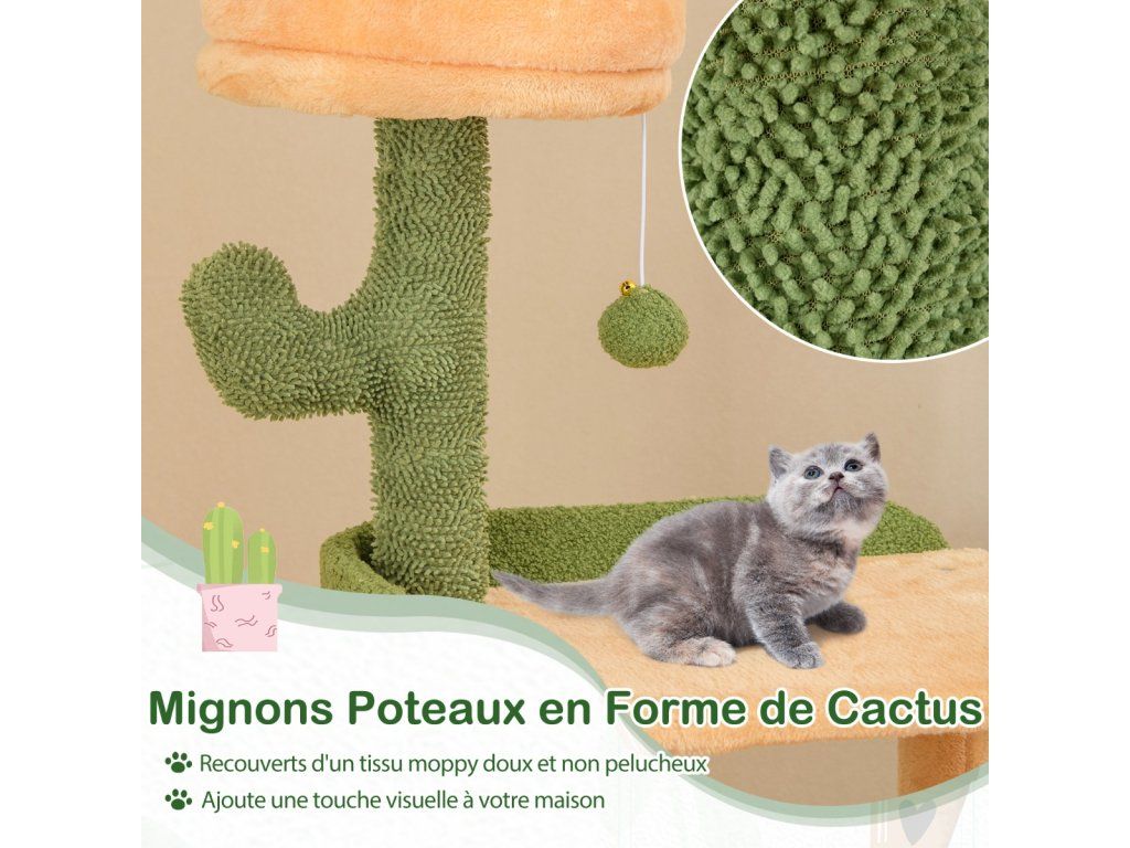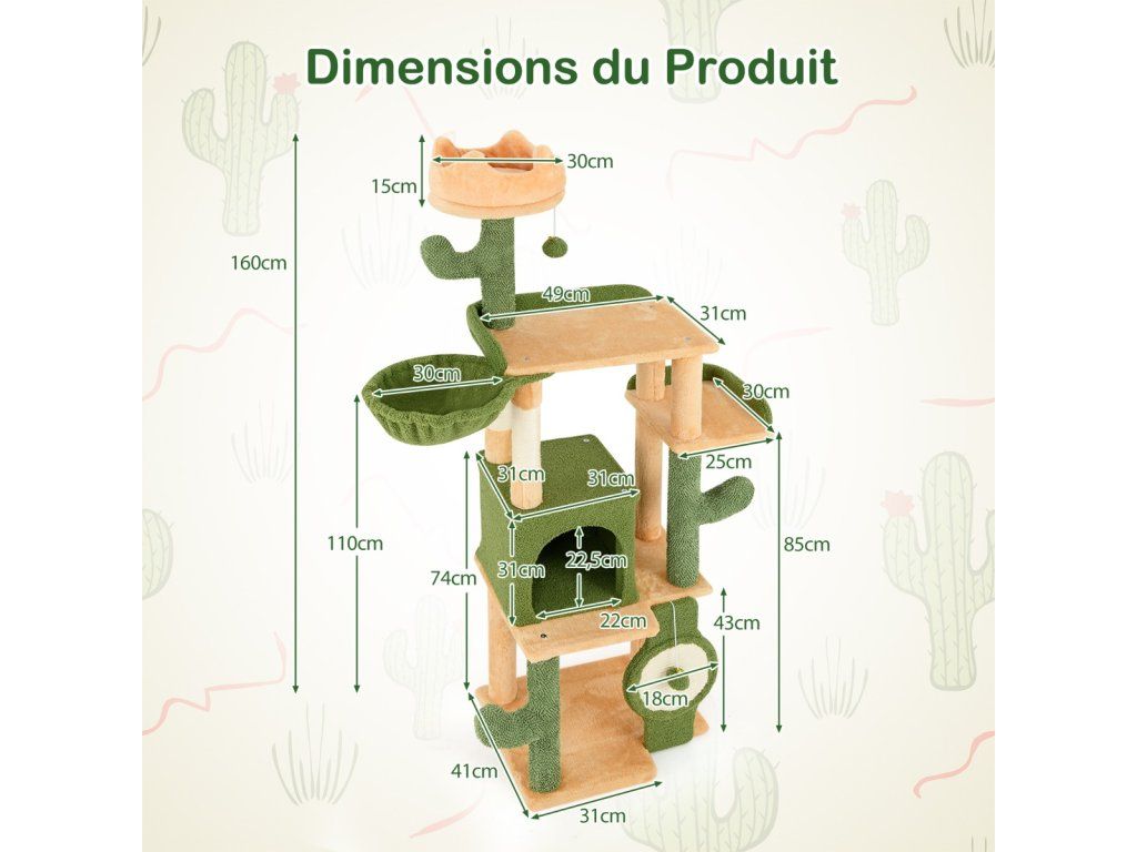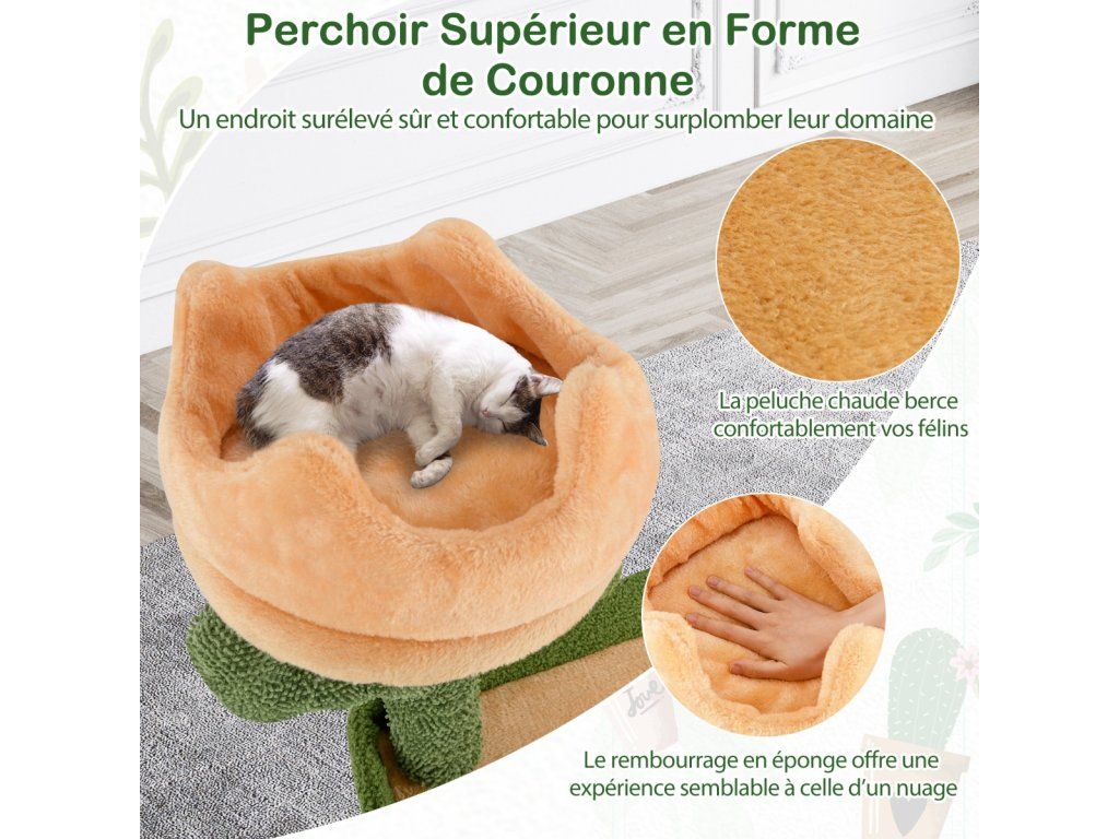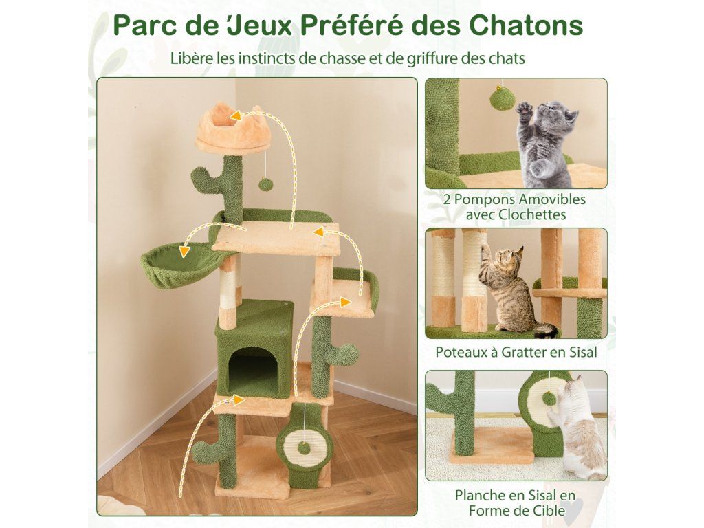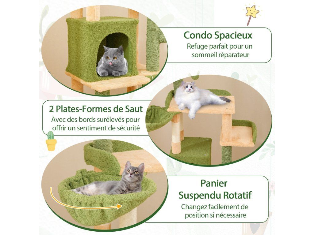 -Crown-shaped top perch with warm plush cradles your felines comfortably-Spacious condo is a perfect hideaway for a restful sleep-2 jumping platforms with raised edges to offer a sense of security-Rotatable hanging basket allows you to easily change the position when needed-Sisal scratching posts and target-shaped sisal board encourage pets to grind claws-2 removable pompoms with bells offer more fun for furry friends-Compared to others without anti-tipping device, ours is a safer choice-Stable base and multiple supporting posts ensure a reliable foundation-Covered with soft and lint-free moppy fabric for added comfort-Cute cactus posts add visual delight to your homeBuďte první, kdo napíše příspěvek k této položce.