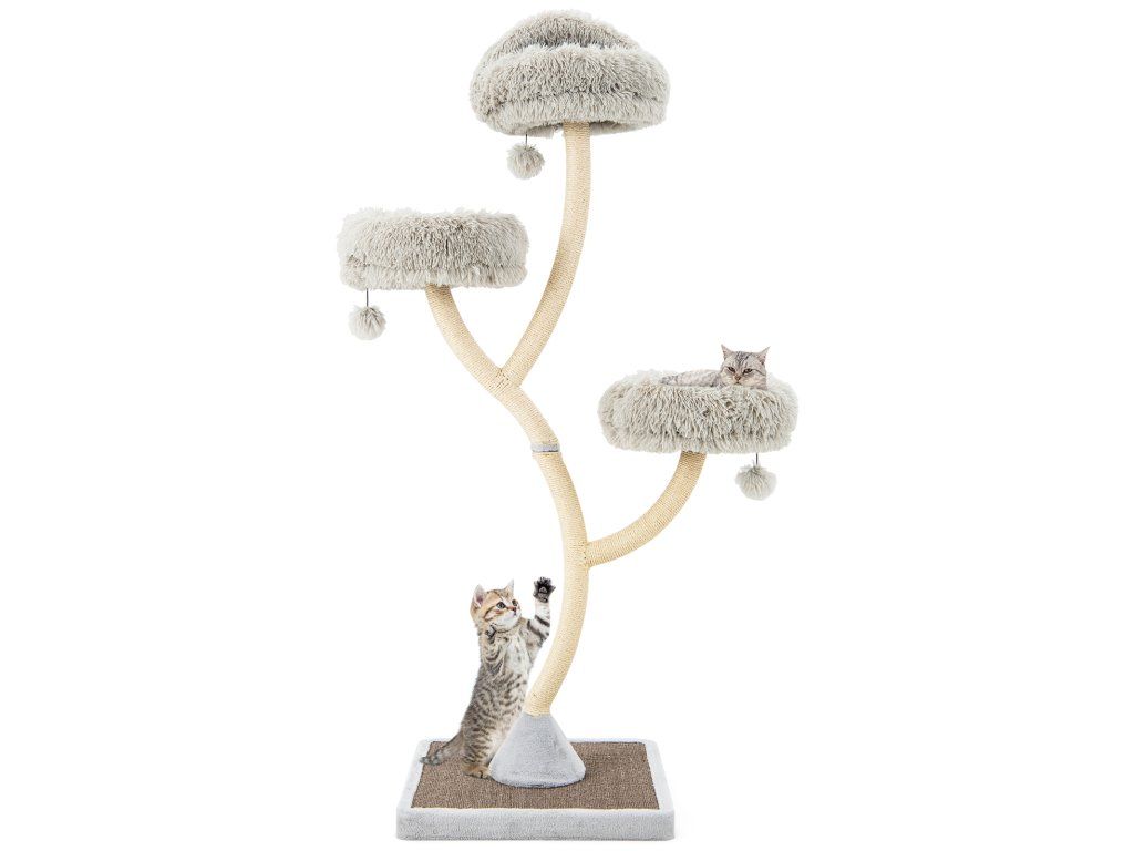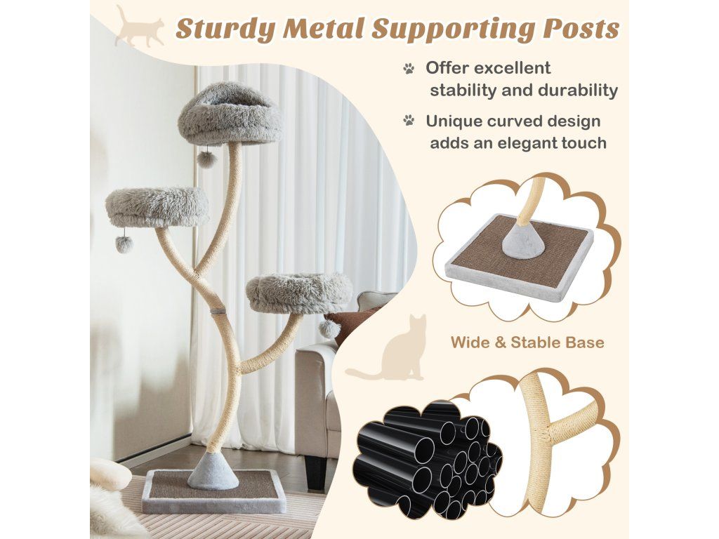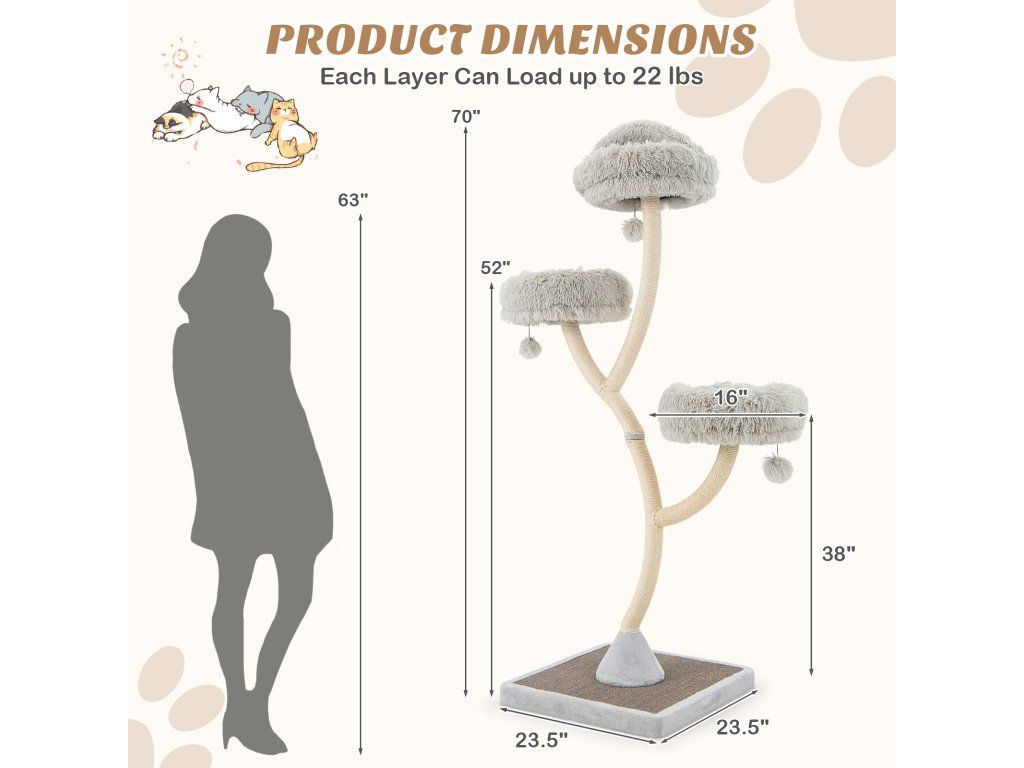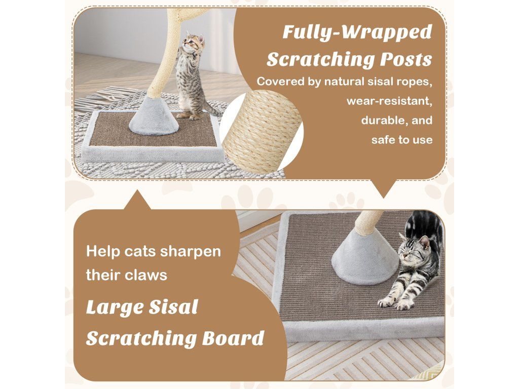 Multifunctional Design: The 70" tall multifunctional cat tower is designed with a cozy top perch and 2 spacious side perches, offering a luxurious napping experience while allowing kittens to enjoy the beautiful scenery outside the window. Moreover, there exist 3 amusing dangling balls for adding more fun. Sturdy Metal Frame: In contrast to normal wooden cat trees, our cat tower is supported by sturdy metal supporting posts, offering excellent stability and durability. The metal posts are fully covered, ensuring safety. In addition, its unique curved design adds an elegant touch to your home decor. Durable Scratching Posts and Board: The cat climbing stand is equipped with fully wrapped scratching posts and a large sisal board, which can help cats sharpen their claws and protect your furniture from destruction. Moreover, it is covered by natural sisal ropes, which are wear-resistant, durable, and safe to use. Detachable Ultra-soft Plush Cushions: The cat furniture is designed with 3 soft and pet-friendly plush cushions, providing a comfy sleeping experience for your lovely kittens. Furthermore, the cushions can be detached and washed, keeping clean and hygienic. We recommend hand washing rather than machine washing. Stylish Appearance and Easy Assembly: Combing with aesthetics and practicality, the gorgeous and attractive cat tower will blend into your home decor perfectly as a piece of modern cat furniture. Other than that, with clear illustrations and all parts numbered in the user's manual, it is easy to set up this cat tower.Buďte první, kdo napíše příspěvek k této položce.