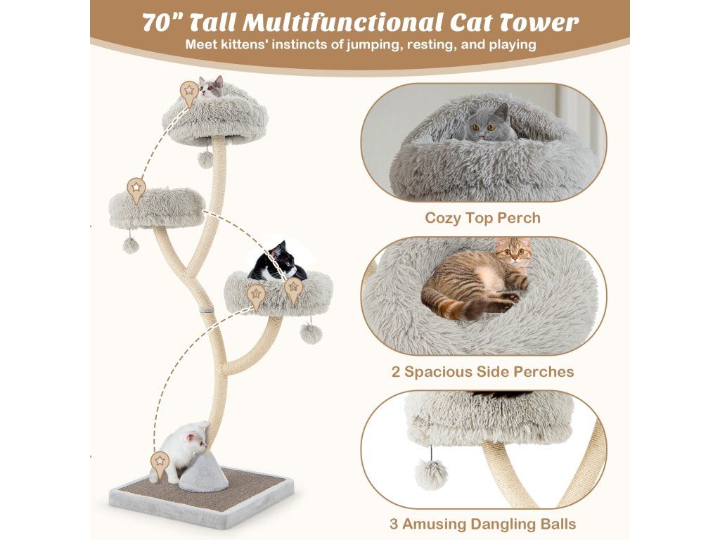 70" Tall Cat Tree 4-Layer Cat Tower with 3 Perches and Dangling Balls-Gray
