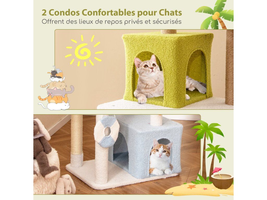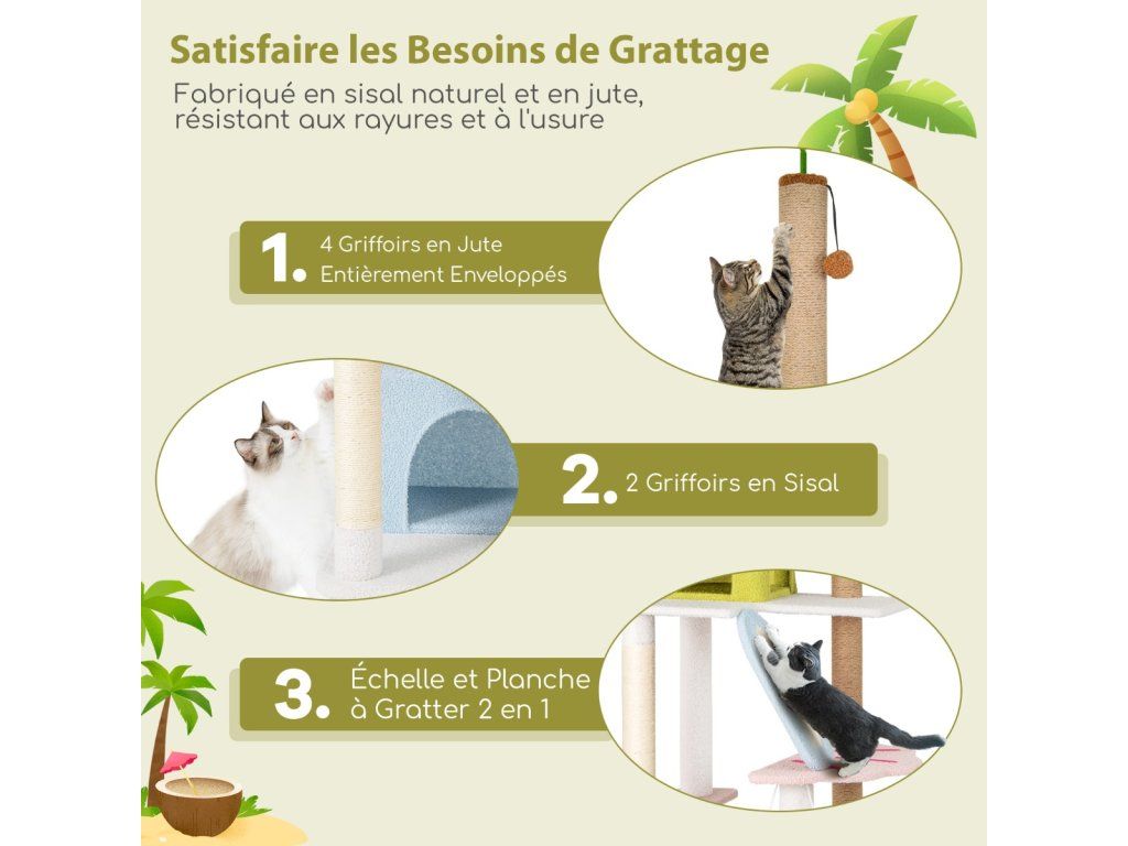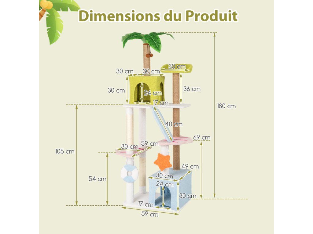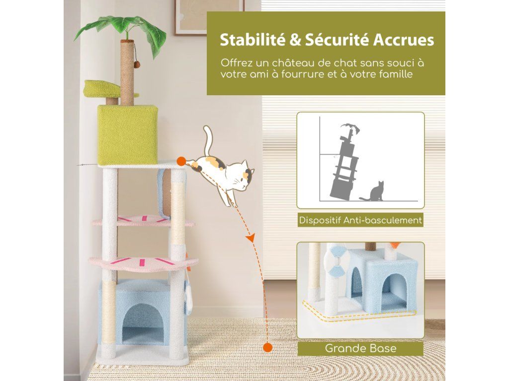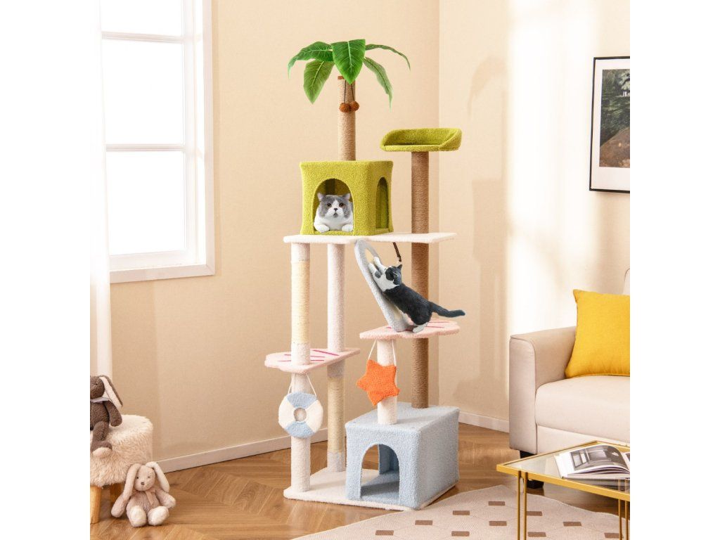 -Comes with a top perch for cats to lounge and observe their surroundings-2 cozy cat condos offer private and secure resting spots, each with 2 cat holes-The teddy plush fabric covering offers an ultra-soft and skin-friendly touch-Features scratching posts and board, allow cats to grind claws and release instincts-The scratching surfaces are made of natural sisal and jute, resistant to scratch and wear-The anti-toppling device secures the tree on the wall for enhanced stability -The hanging toys produce enticing sounds when pressed or batted by your cat-The interactive plush dangling balls spark curiosity and play for added fun-Comes with 2 pink shell-shaped platforms for jumping or resting-The lifelike artificial green leaves add a touch of nature to your home decorationBuďte první, kdo napíše příspěvek k této položce.