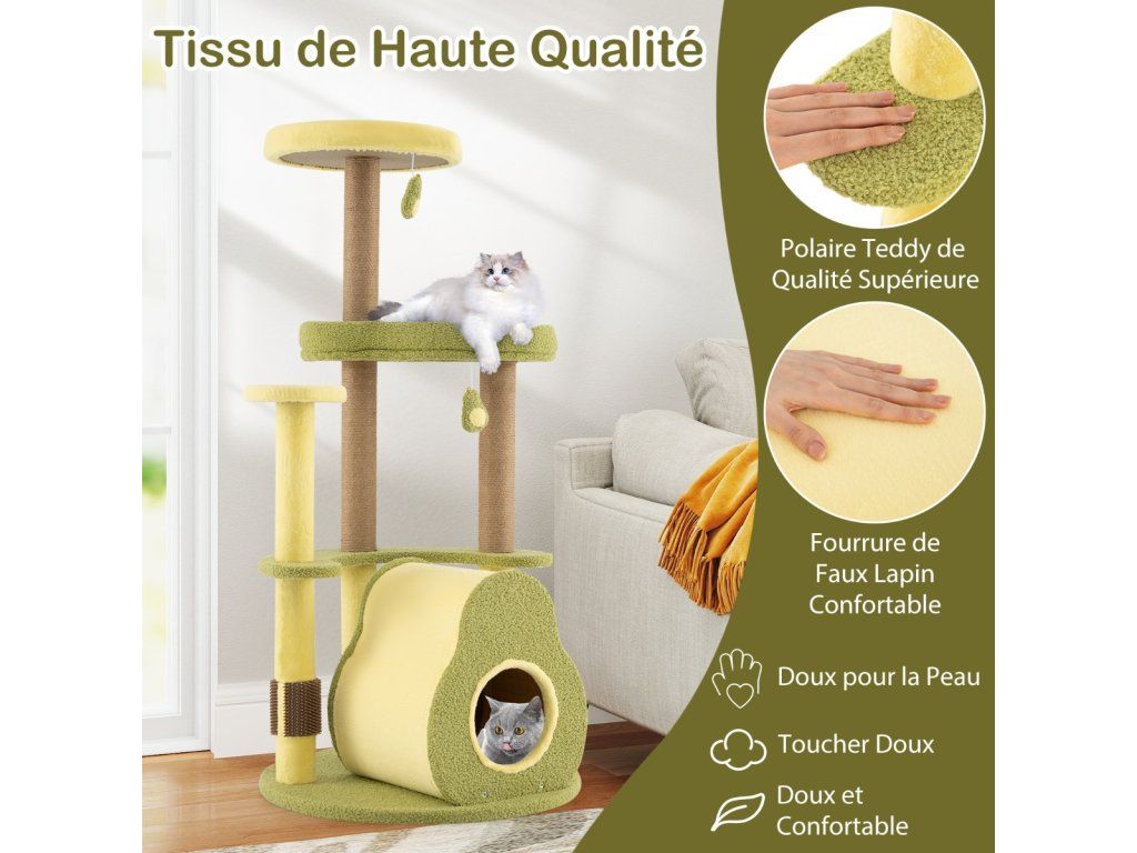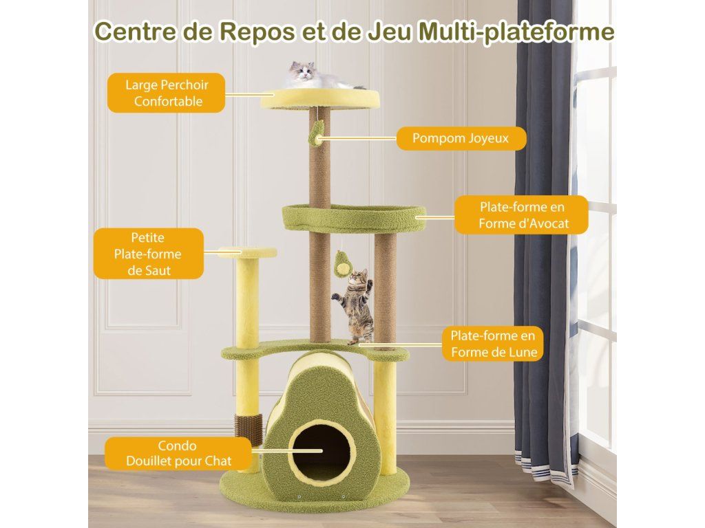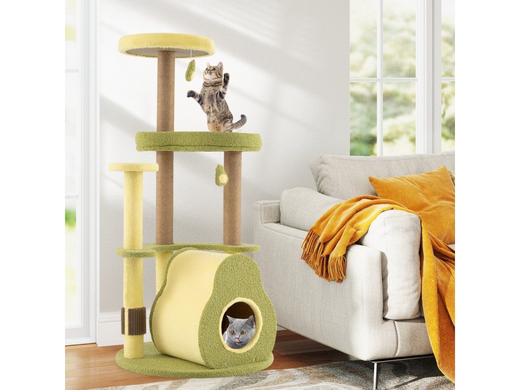 Are your feline friends in need of a luxurious and engaging space? Look no further than this multi-level avocado cat climbing frame. This cat tree allows your cat lounging on a wide perch, leaping between an avocado-shaped platform and a small jumping platform, or basking on a moon-shaped platform, along with a cat house offers a private sanctuary. Additionally, it is wrapped in plush, skin-friendly fabrics that not only pamper your cat's senses but are also hassle-free to clean. Equipped with premium scratching posts, a self-grooming brush and a scratching board, This cat tower caters to your cat's instincts while keeping your home's decor intact. With safety in mind, this cat tree is designed with rounded edges and robust posts, creating a stable and secure environment for your pet. Various Cozy Spots: This multi-level cat tower features a wide comfortable perch, an avocado-shaped platform, a small jumping platform, and a moon-shaped platform, catering to your cat's needs for climbing, resting, and playing. Plus, it also comes with a cat house for added privacy and a sense of security. Premium Plush Fabric: Crafted with skin-friendly and soft teddy fleece and plush fabric, this cat tree offers a super comfortable touch. These high-quality materials not only provide ultimate comfort for your cat but are also easy to clean and maintain. Release Cat's Scratching Instinct: This avocado cat climbing frame features premium scratching posts and scratching board with wear-resistant jute rope, providing an ideal area for your cat to scratch and keep your furniture safe. Moreover, the cat self-grooming brush also help to fulfill their natural instinct . More Exquisite Details: Equipped with rounded edges to reduce the risk of injury and sturdy supporting posts for stability, this cat climbing furniture is safe to use. Plus, the fun pompoms add more interactive fun to your cats. Stable Frame and Dimensions: This freestanding cat tree is supported by a wide round base and sturdy supporting posts, which is sturdy for long-term use. The overall dimensions are 59 x 59 x 124 cm (L x W x H).Buďte první, kdo napíše příspěvek k této položce.