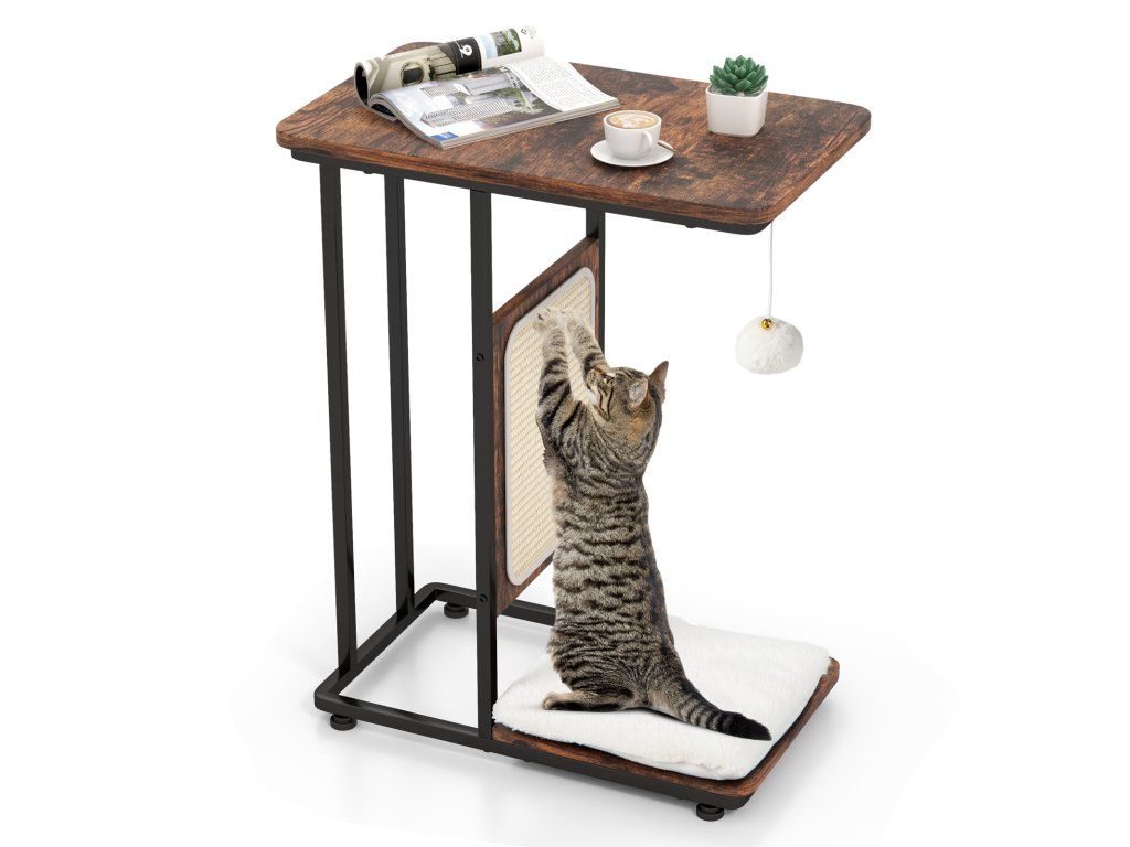 C- Shaped Cat Side Table Cat Tree with Scratching Board-Rustic Brown