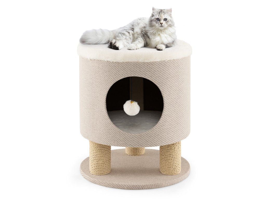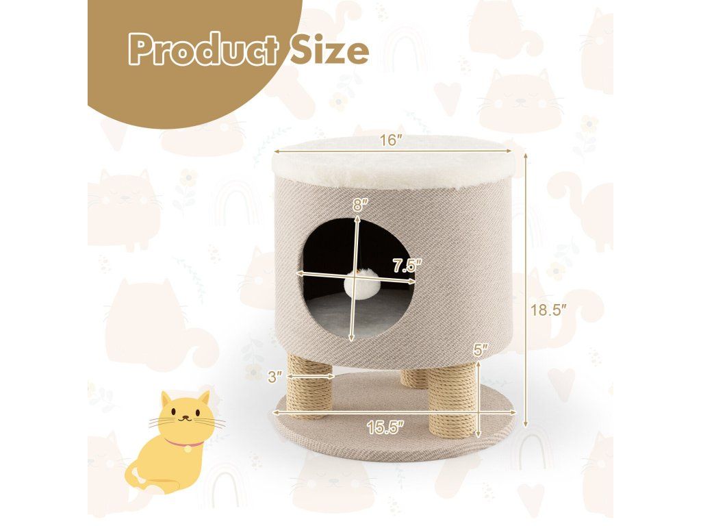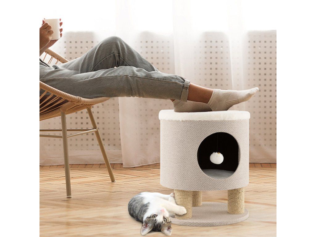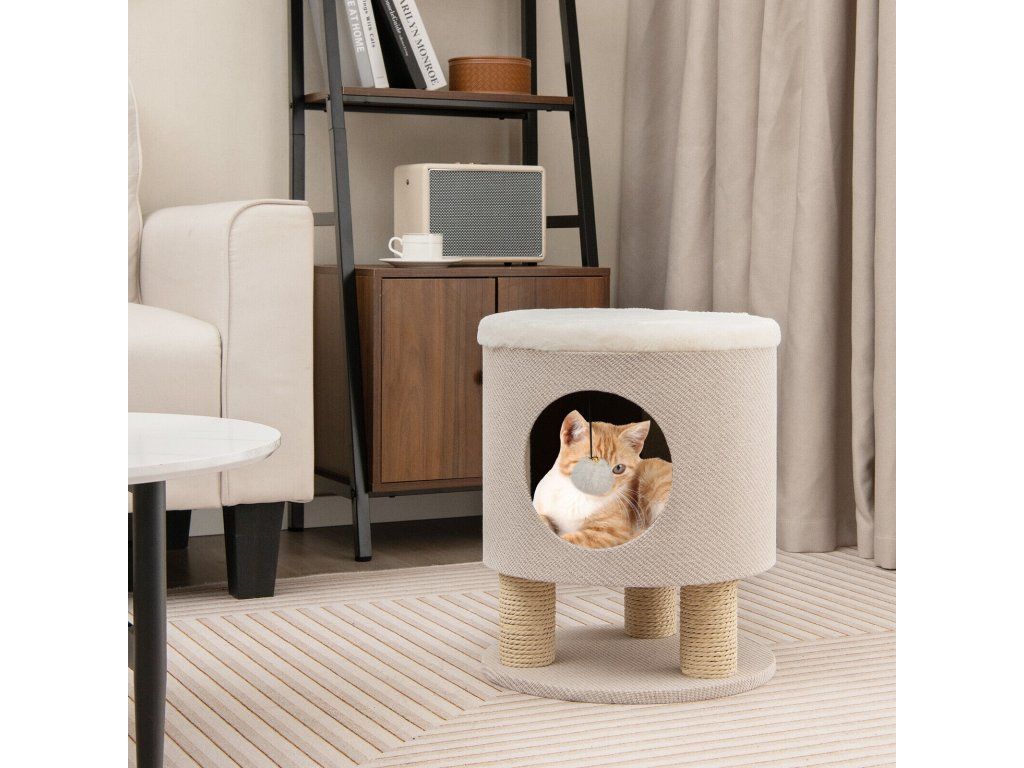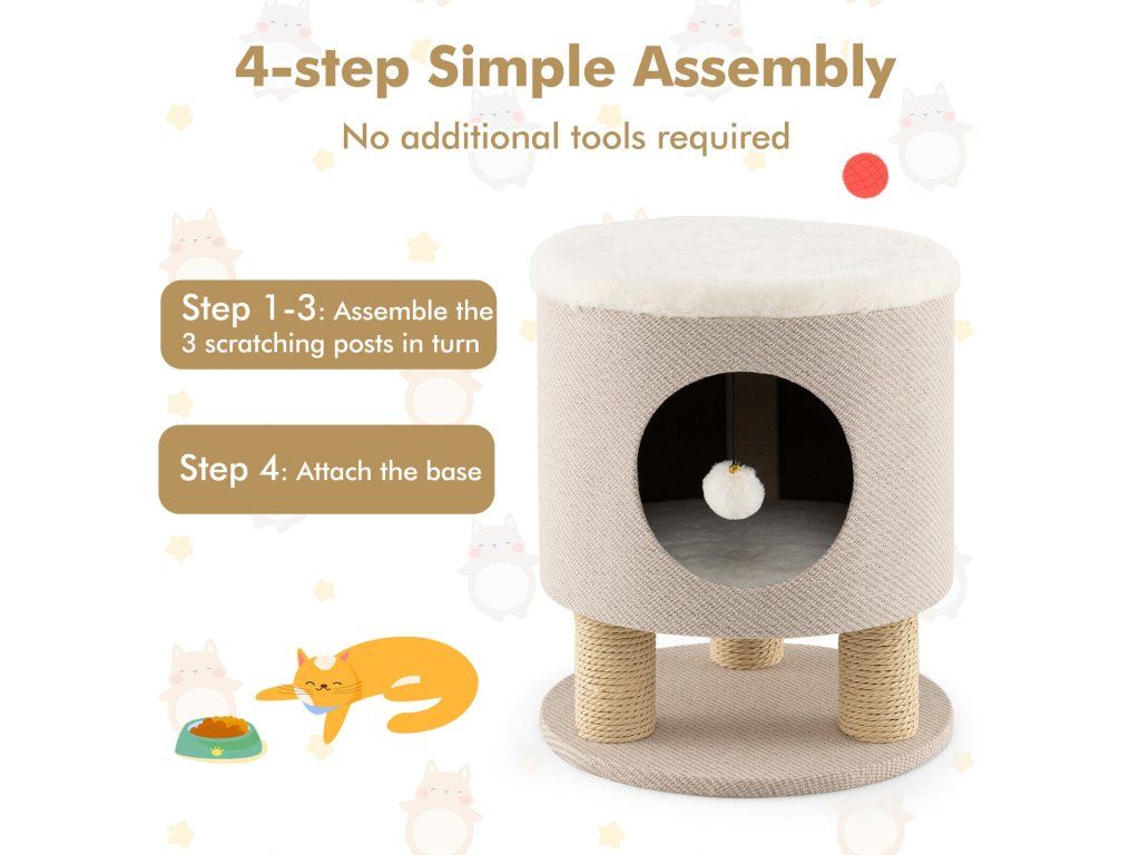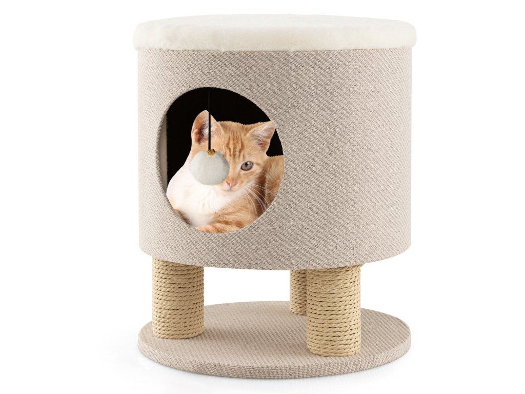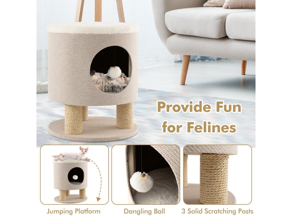Cat Condo Stool for Indoor Cats with Scratching Posts and Plush Ball Toy-Beige