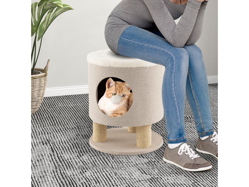The cat condo stool is a versatile and innovative piece of cat furniture that not only provides a cozy place for your feline friends to rest and play. Meanwhile, it is a comfortable ottoman or stool. The cat condo stool features 3 sturdy scratching post wrapped with kraft paper rope, which help to keep your cat’s claws in healthy condition while protecting furniture from scratches. Additionally, it comes with a hanging ball to provide fun for felines. And the cat condo stool is the perfect solution for you to have interactions with your cats. You can sit on the stool, then bend over to play with your furry friends. The cat house is covered with faux linen fabric for excellent wear-resistance and chic appearance. Besides, the cat house allows you to assemble with ease. If you are looking for a cat condo stool like this, do not hesitate to place an order! Innovative 3-in-1 Design: Not only is the cat condo a haven for your pets, but it also serves as a delightful piece of furniture for you. Designed with a plush seat, it provides pet parents with the perfect spot to sit. Or you can use it as an ottoman to relax your legs. Cozy and Private Cat Condo: The cat condo stool features a spacious condo that caters to your feline's natural instinct of hiding. With soft plush at the bottom, your feline companion can rest in absolute comfort and enjoy a sound sleeping. And the large entry provides easy access. Release Instinct and Offer Fun: The cat condo stool features 7.5 cm scratching posts made of anti-scratch kraft paper rope. These posts provide the perfect outlet for your cat to groom their paws without causing any harm to your furniture. And the fluffy hanging ball ensures that boredom is kept at bay. Soft and Stable Structure: The seat cushion is made of soft faux angora, providing a smooth and skin-friendly touch. And the main body of the cat cube bed is covered with faux linen, which is wear-resistant. Moreover, the enlarged base will further improve stability. Hassle-free Assembly: With detailed instruction and complete accessories, the cat condo stool can be quickly setup without additional tools and complicated steps. The product size:40 cm x 40 cm x 47cm(L x W x H). The weight capacity is 150 kg.Buďte první, kdo napíše příspěvek k této položce.