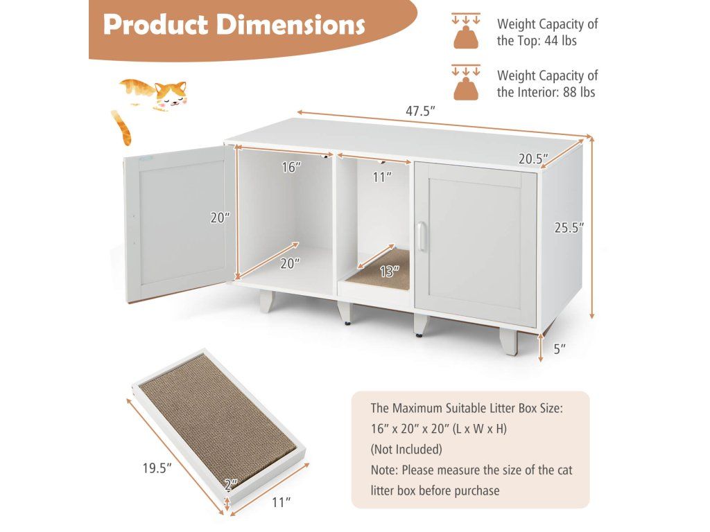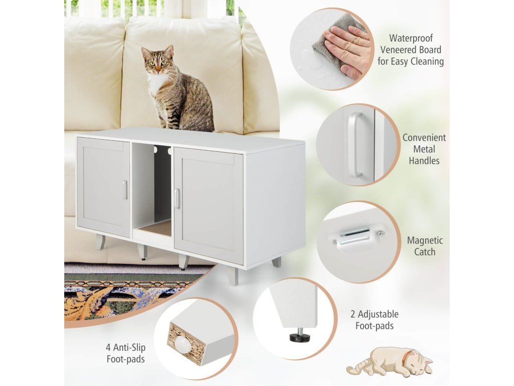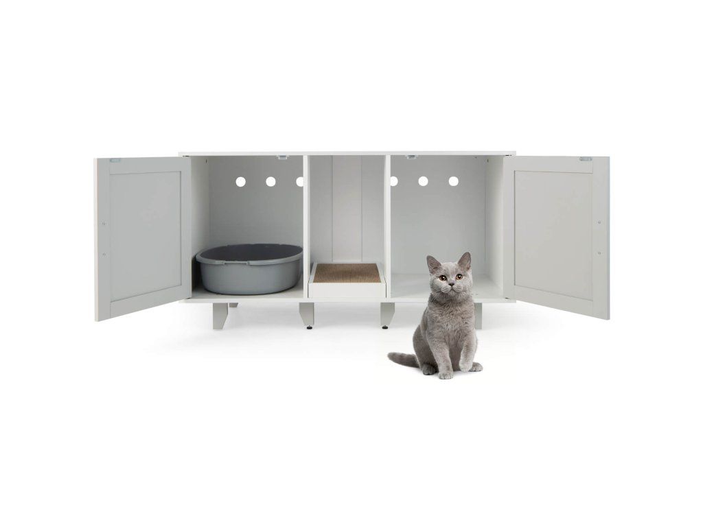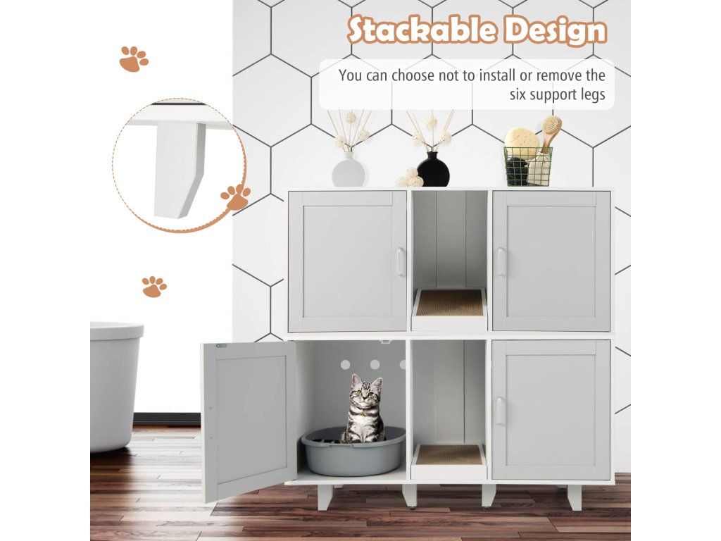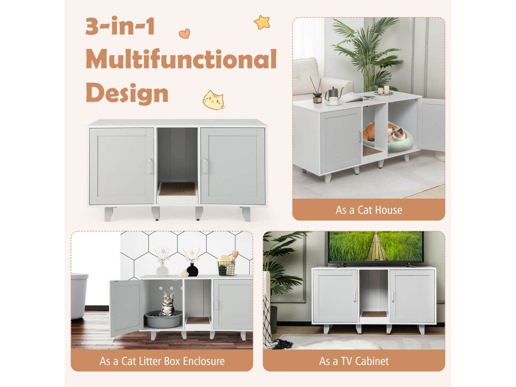 Provide a Comfortable Toileting Experience for Your Lovely Kitten! With the wide tabletop, the cat furniture can also be used as a TV stand that can hold TV screens up to 50". With 2 individual compartments, this hidden cat washroom is great for safeguarding your cats' privacy, allowing them to unleash their natural instincts. Cats can also enjoy scratching fun with the medium scratching board, effectively preventing them from scratching everywhere. In addition, it is equipped with 4 metal legs guaranteeing great stability and durability, and the metal legs can be detached for stacked storage. With its elegant and vintage appearance, the cat litter box furniture can be a perfect decoration and brighten your room. Bullet Point: 3-in-1 Multifunctional Cat Furniture: The multifunctional cat furniture cabinet can not only be used as a cat litter box enclosure or cat house to hide cat litter boxes or beds, but also as a TV stand, coffee table, or end table. And with its modern and chic appearance, the cat litter cabinet could perfectly blend into any home style. Provide Privacy: The hidden cat washroom can be a perfect spot for kittens to enjoy private potty time and allow them to find a sense of security and belongings in the enclosed environment. More than that, it can also be a good solution to prevent litter from being scattered everywhere and reduce unpleasant smells. Winding Entry & Scratching Board: The wooden cat furniture is designed with 2 compartments and winding entries, which can add fun for cats who love exploring while preventing the litter from being carried off the cabinet. Besides, there exists a removable scratching board for cats to grind their paws. Stable Structure & Stackable Design: The cat litter box enclosure adopts thick boards and 6 supporting legs, ensuring great stability and a large loading capacity (the tabletop loads up to 20kg and the interior 40kg). And there exist adjustable footpads for keeping stable even on uneven floors. Moreover, the supporting legs can be easily removed, so the cat furniture can be stacked to meet different needs. Ample Storage Space: The wooden cat litter cabinet is designed with 2 compartments that allow 2 cats to use the cat washroom simultaneously, and each compartment measures 41 x 50.5 x 51 cm( L x W x H). Notice: Please measure the size of your cat litter box before purchase. In addition, the wide tabletop measure 120 x 52 cm(L x W), which can fit most flat TV screens up to 50". Features: Can be used as a cat litter box enclosure, side table, TV stand, coffee table, etc The spacious tabletop can be used for putting TVs, decors, cat supplies, etc Provide privacy and save you from the trouble of scattered litter and offending smells The winding entry allows cats to move from one divider to another divider The scratching board protects furniture from scratches, easily removed for cleaning Thick boards and supporting legs ensure excellent sturdiness and stability 6 wooden legs can be detached, the cabinets can be stacked for space-saving storage The adjustable footpads enhance stability while preventing slipping 3 ventilated holes promote air circulation and keep the interior clean and fresh The veneered boards are smooth, scratch-resistant, and waterproof for easy cleaning Specification: Color: Gray Material: PB, MDF Overall Dimensions: 120 x 52 x 65 cm (L x W x H) Size of the Compartment: 41 x 50.5 x 51 cm (L x W x H) Weight Capacity of the Tabletop: 20 kg Weight Capacity of the Interior Board: 40 kg Net Weight: 27 kg Package Includes: 1 x Cat Litter Box Enclosure 1 x User's ManualBuďte první, kdo napíše příspěvek k této položce.