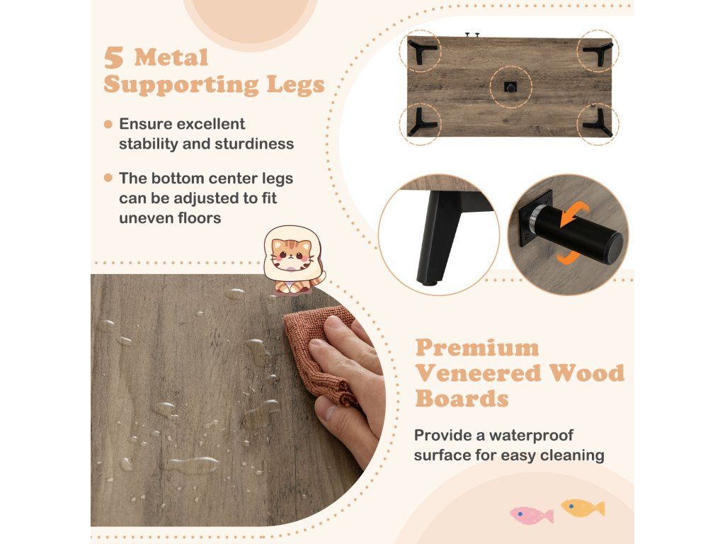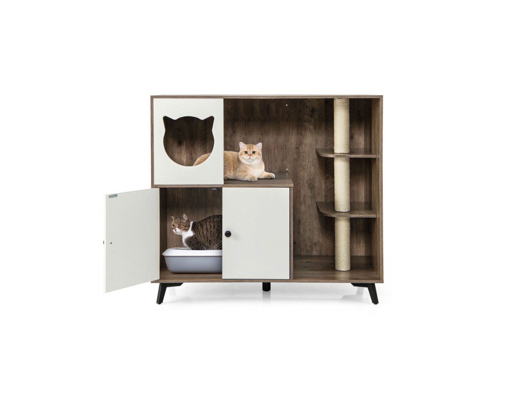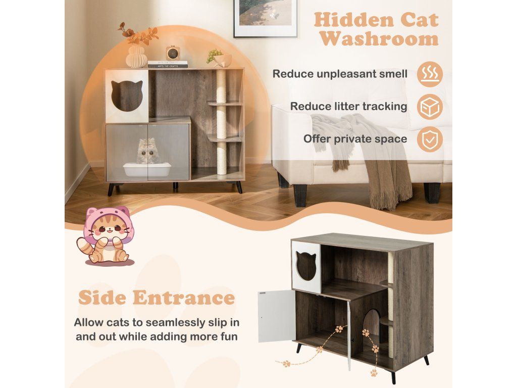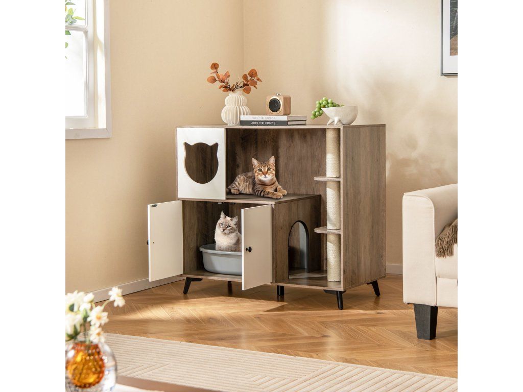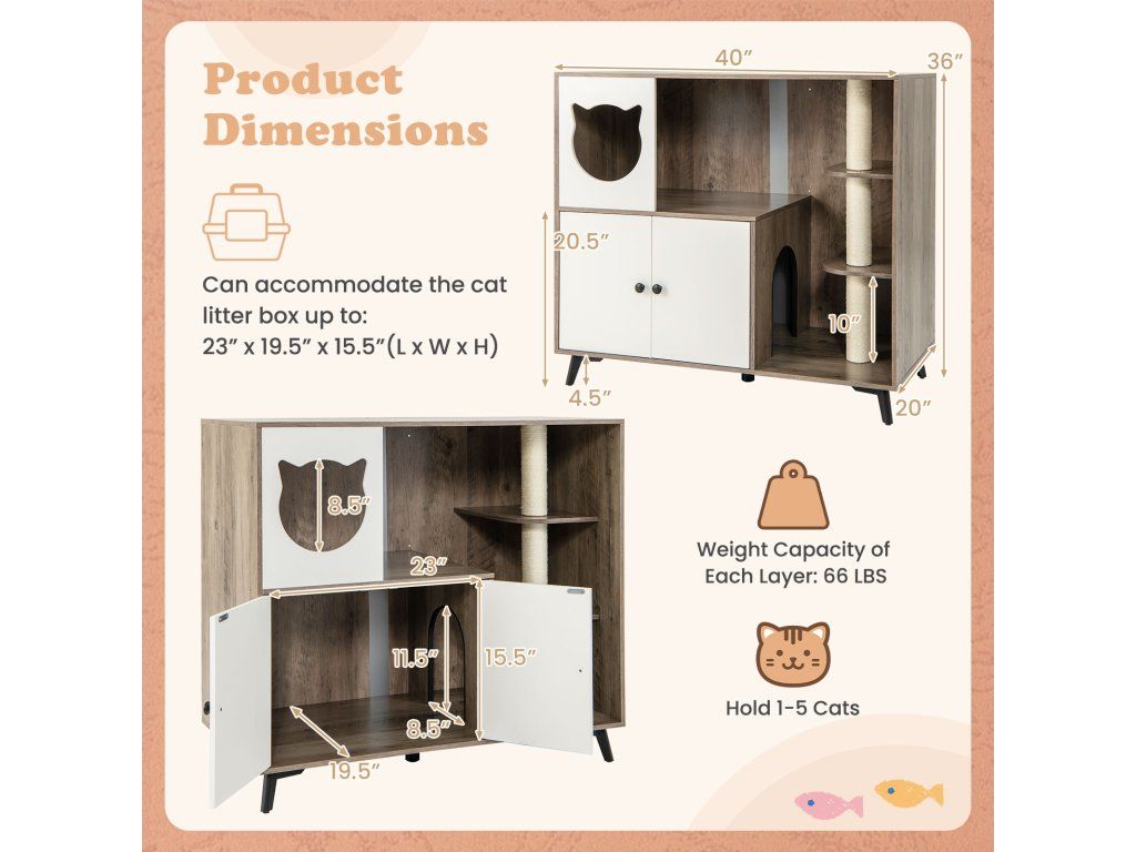 This innovative cat cabinet furniture combines the functions of cat litter box enclosures and cat trees, providing a multifunctional haven for your beloved feline. There are 3 scratching posts, a hidden cat washroom, and a cat condo, offering ample space for your pet to play, scratch, relax, and toilet. The double-door cat litter box enclosure can not only provide privacy and convenience for kittens, but also minimize odors and prevent litter from scattering. Other than that, the scratching posts are covered by natural sisal ropes, making sure they are safe for your furry friends to grind paws. To enhance its stability, the cat house is equipped with 4 metal legs and an adjustable metal legs, therefore cats can jump up and down without worrying. It measures 100 x 51 x 91 cm (L x W x H), which is large enough for various cat activities. Thanks to its multifunctional design, this cat furniture can be served as a cat litter box enclosure, cat house, or storage cabinet. Bullet Point: All-in-1 Design: This cat cabinet furniture offers a play area, rest area, and a private potty area to meet various cat activities. There are 3 scratching posts for frolicking, a cat condo with a cute cat hole for relaxation, and a cat litter box enclosure for privacy during bathroom breaks. Large Space and Multipurpose Design: This multifunctional cat furniture measures 100 x 51 x 91 cm (L x W x H), offering ample space for pets to roam and play. And there exists a spacious tabletop for tidily organizing cat supplies or displaying decorations. Moreover, it can be not used as a cat litter box enclosure, but also a cat house, storage cabinet, or coffee table. Privacy Protection and Easy Access: The bottom hidden cat washroom could offer private space for cats while reducing unpleasant smells and reducing litter tracking, which could keep your room clean and tidy. Additionally, thanks to its double doors and a side entrance, cats can effortlessly slip in and out. 3-Tier Cat Tree for Scratching: The cat cabinet is equipped with 3 fully-wrapped scratching posts and 2 platforms for standing, which could help cats sharpen their claws. Besides, it is covered with safe and healthy natural sisal ropes, which are wear-resistant and scratch-resistant, ensuring long-term use. Sturdy and Stable Construction: This cat house is supported by 5 metal supporting legs and constructed of thick veneered wood boards, ensuring excellent stability and sturdiness. Each layer can load up to 30 kg. Furthermore, the bottom center leg can be adjusted to fit uneven floors. The interior of the cat litter box enclosure measures 58 x 50 x 40 cm (L x W x H), please measure the size of your litter box before purchase.Buďte první, kdo napíše příspěvek k této položce.