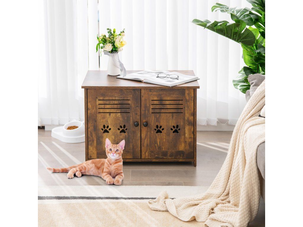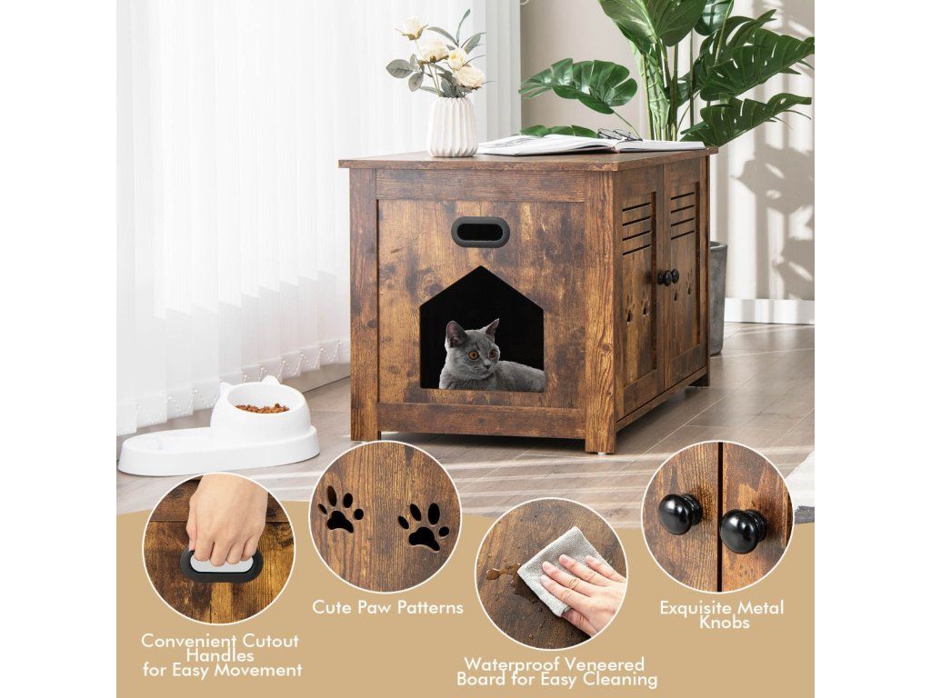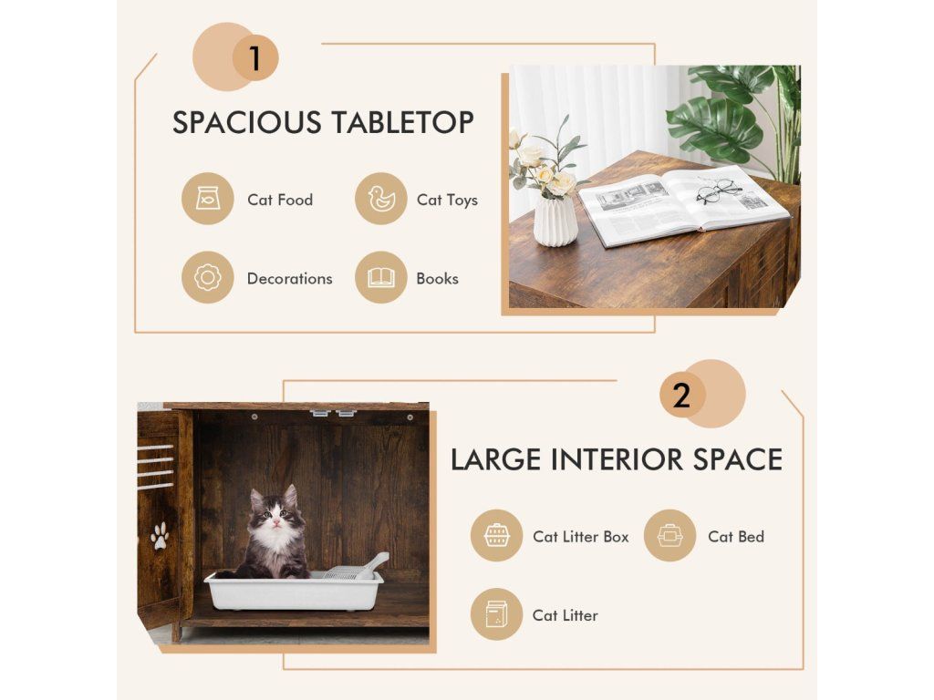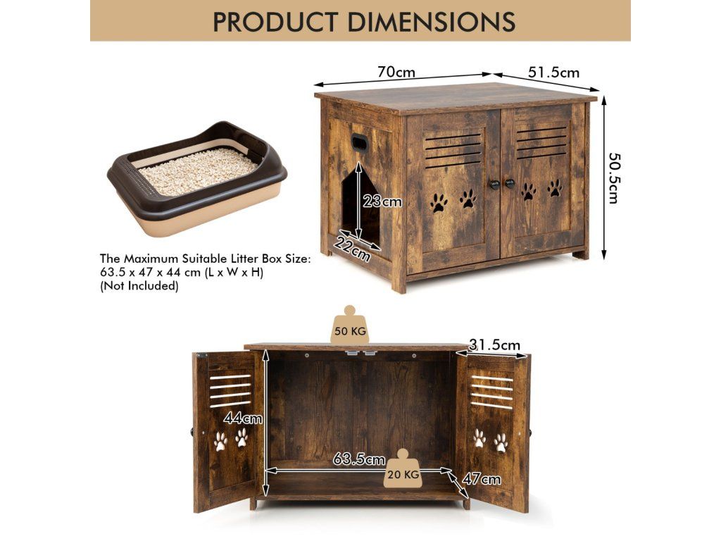 Bring a Private & Comfortable House for Your Lovely Kitten! The cat litter box enclosure measures 70 x 52 x 51 cm(L x W x H) and the interior measures, can accommodate most cat litter boxes. (Notice: Pleasure the size of your cat litter box before purchase). More than that, it can also serve as a coffee table, side table, end table, or nightstand, which can perfectly blend with any corner of your home. The spacious tabletop is suitable for placing magazines, potted plants, decorations, and cat supplies, keeping your living space tidy and clean. Besides, it is designed with double louvred doors and a side entrance to promote air circulation. Besides, it adopts thickened boards ensuring excellent durability and a large loading capacity (the tabletop loads up to 50 kg, and the interior board loads up to 20 kg). Cats need a private and safe place, and this cat litter box enclosure would be a perfect gift for them! Bullet Point: 3-in-1 Multifunctional Design: This cat furniture hidden cabinet can not only be used as a cat litter box enclosure to keep the cat litter box hidden away from guests but also as a cat house providing a comfortable lounging area for your lovely kittens. And thanks to the spacious tabletop, it can also serve as a coffee table to enjoy afternoon teas or put decorations. Provide Privacy: The hidden cat washroom can be a perfect spot for kittens to enjoy private potty time and allow them to find a sense of security and belongings in the enclosed environment. More than that, it can also be a perfect helper to prevent litter from being scattered everywhere and reduce the spreading of offending odours. Good Ventilation: The cat house end table is equipped with double louvred doors for promoting good ventilation while bringing convenience for scooping litter. Besides, there exists a side entrance allowing cats to seamlessly slip in and out. And it can be installed on the left or right. Vintage & Elegant Style: The decorative cat furniture adopts a rustic finish and unique barn doors, which can be a perfect addition to your home decoration, turning the once-unpleasant spot into an eye-catching spot. And the tabletop loads up to 50 kg, providing enough space for cat supplies and decorations. Easy Movement & Convenient Cleaning: The cat litter box enclosure is designed with 2 cutout handles on the sides for easy movement. In addition, it is made of veneered MDF and particle boards, which are durable, scratch-resistant, smooth, and waterproof for easy cleaning. Features: Can be used as a cat litter box enclosure, cat house, nightstand, or side table With the vintage and chic appearance, add an elegant charm to your home The vintage and chic look of the furniture blends with your home decor Provide privacy and save you from the trouble of scattered litter and offending smells The double louvred doors allow you to scoop the litter and clean inside easily The side entrance allows kittens to get in or out of the cabinet freely The large tabletop provides enough space for cat supplies, cat beds, and decor The premium boards with veneered finishes are waterproof and durable Decorated with cute paw patterns on the doors, add fun and attract cats' attention Specifications: Colour: Rustic Brown Material: MDF, Particle Board Overall Dimensions: 70 x 52 x 51 cm(L x W x H) Weight Capacity of the Tabletop: 50 kg Weight Capacity of the Interior Board: 20 kg Net Weight: 14 kg Package Includes: 1 x Cat Litter Box Enclosure 1 x User's ManualBuďte první, kdo napíše příspěvek k této položce.
