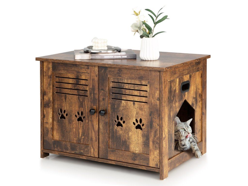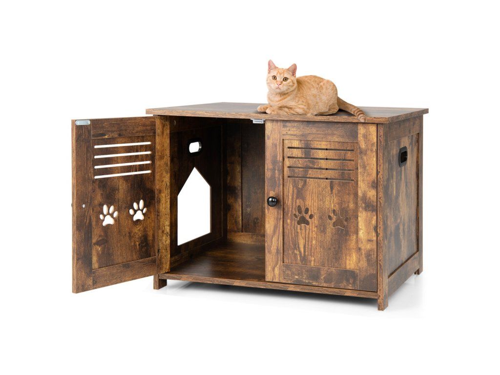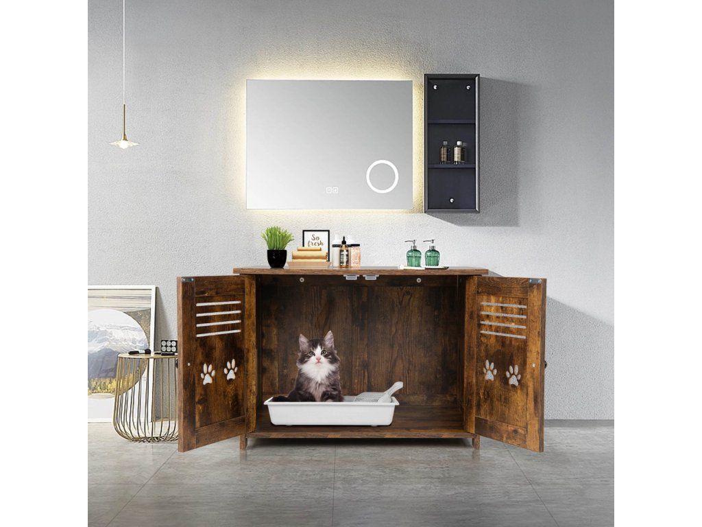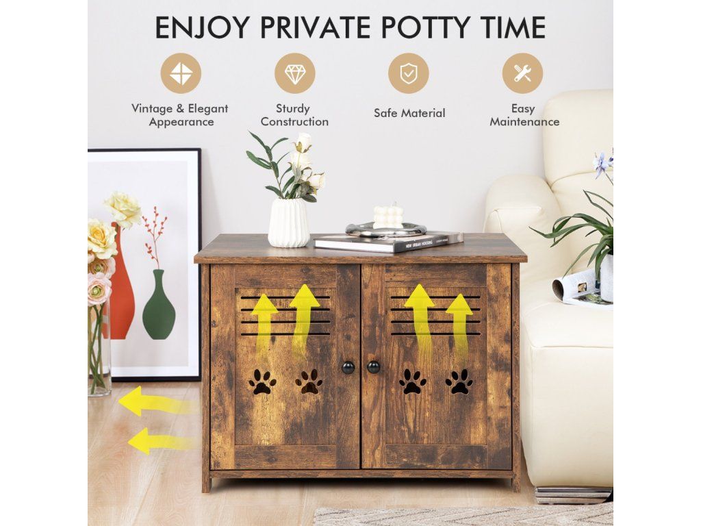 Bring a Private & Comfortable House for Your Lovely Kitten! The cat litter box enclosure measures 70 x 52 x 51 cm(L x W x H) and the interior measures, can accommodate most cat litter boxes. (Notice: Pleasure the size of your cat litter box before purchase). More than that, it can also serve as a coffee table, side table, end table, or nightstand, which can perfectly blend with any corner of your home. The spacious tabletop is suitable for placing magazines, potted plants, decorations, and cat supplies, keeping your living space tidy and clean. Besides, it is designed with double louvred doors and a side entrance to promote air circulation. Besides, it adopts thickened boards ensuring excellent durability and a large loading capacity (the tabletop loads up to 50 kg, and the interior board loads up to 20 kg). Cats need a private and safe place, and this cat litter box enclosure would be a perfect gift for them! Bullet Point: 3-in-1 Multifunctional Design: This cat furniture hidden cabinet can not only be used as a cat litter box enclosure to keep the cat litter box hidden away from guests but also as a cat house providing a comfortable lounging area for your lovely kittens. And thanks to the spacious tabletop, it can also serve as a coffee table to enjoy afternoon teas or put decorations. Provide Privacy: The hidden cat washroom can be a perfect spot for kittens to enjoy private potty time and allow them to find a sense of security and belongings in the enclosed environment. More than that, it can also be a perfect helper to prevent litter from being scattered everywhere and reduce the spreading of offending odours. Good Ventilation: The cat house end table is equipped with double louvred doors for promoting good ventilation while bringing convenience for scooping litter. Besides, there exists a side entrance allowing cats to seamlessly slip in and out. And it can be installed on the left or right. Vintage & Elegant Style: The decorative cat furniture adopts a rustic finish and unique barn doors, which can be a perfect addition to your home decoration, turning the once-unpleasant spot into an eye-catching spot. And the tabletop loads up to 50 kg, providing enough space for cat supplies and decorations. Easy Movement & Convenient Cleaning: The cat litter box enclosure is designed with 2 cutout handles on the sides for easy movement. In addition, it is made of veneered MDF and particle boards, which are durable, scratch-resistant, smooth, and waterproof for easy cleaning. Features: Can be used as a cat litter box enclosure, cat house, nightstand, or side table With the vintage and chic appearance, add an elegant charm to your home The vintage and chic look of the furniture blends with your home decor Provide privacy and save you from the trouble of scattered litter and offending smells The double louvred doors allow you to scoop the litter and clean inside easily The side entrance allows kittens to get in or out of the cabinet freely The large tabletop provides enough space for cat supplies, cat beds, and decor The premium boards with veneered finishes are waterproof and durable Decorated with cute paw patterns on the doors, add fun and attract cats' attention Specifications: Colour: Rustic Brown Material: MDF, Particle Board Overall Dimensions: 70 x 52 x 51 cm(L x W x H) Weight Capacity of the Tabletop: 50 kg Weight Capacity of the Interior Board: 20 kg Net Weight: 14 kg Package Includes: 1 x Cat Litter Box Enclosure 1 x User's ManualBuďte první, kdo napíše příspěvek k této položce.