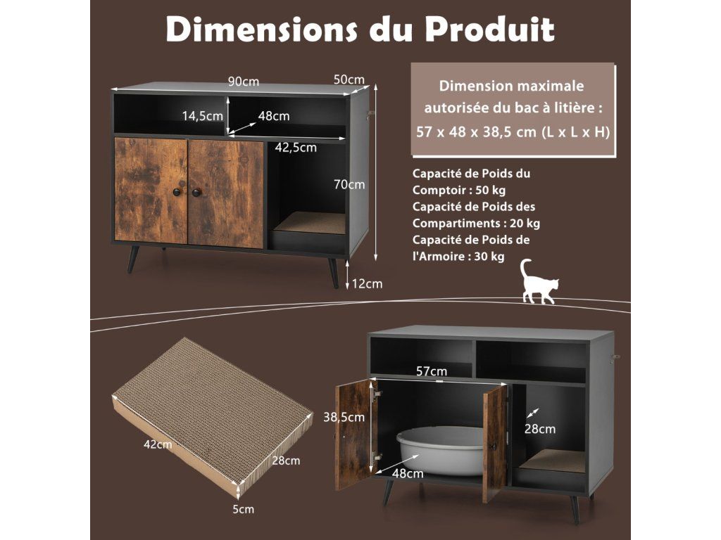 Create A Private and Safe Zone for Your Lovely Cat! This wooden cat litter box enclosure measures 35" x 19.5" x 27.5" (L x W x H) and the interior measuring 21" x 19" x 15" (L x W x H) is perfect for holding various types of cat litter boxes (Notice: Please measure the size of your cat litter box before purchase). It is designed with a large countertop, 2 open compartments, and a double-door cabinet to hold cat supplies, cat litter box, cat bed, ornament, books, and more, keeping items well organized. This cat furniture is equipped with flexible hinges to make it easy to open and close the door, and anti-toppling devices to secure the cabinet on the wall, keeping your lovely kitten in a safe environment. More than that, we also provide a cat scratching pad and a winding entry, giving your furry friend more fun. And it can not only be used as a cat litter box enclosure, but as a side table, as a cat house, and storage cabinet, end table, nightstand, or coffee table, meeting your different needs. Spacious Storage Space: The hidden cat litter box enclosure is designed with 2 open compartments to place cat supplies, cat litter, or daily necessities. And there exists a large countertop for putting some decorations or a cat bed. Besides, the interior measures 21" x 19" x 15" (L x W x H), which is suitable for most cat litter boxes. Sturdy and Stable Construction: The cat furniture is equipped with anti-toppling devices that can be mounted on the wall, effectively avoiding the cabinet from wobbling or tipping over. Moreover, it comes with 4 slanted metal supporting legs, which form a splayed shape and enhance stability and safety. Funny Design: The wooden cat house comes with a cat scratching pad, which is available for cats to grind paws while preventing cat litter from dirtying your room. Furthermore, the winding entry design allows cats to seamlessly slip in and out while adding more fun. Multiple Use: This versatile cat house can not only hide your kitten's litter box or cat bed but also be used as a bedside table in the bedroom, an end table in the dining room, or a coffee table in the living room. Moreover, the elegant and classical appearance can perfectly integrate with your home decor. Provide Privacy: The hidden cat washroom offers a private and comfortable space where your kitten feels safe to have potty time. Plus, the enclosed design aims to greatly reduce unpleasant smells and reduce litter tracking, keeping your room clean and tidy.Buďte první, kdo napíše příspěvek k této položce.
