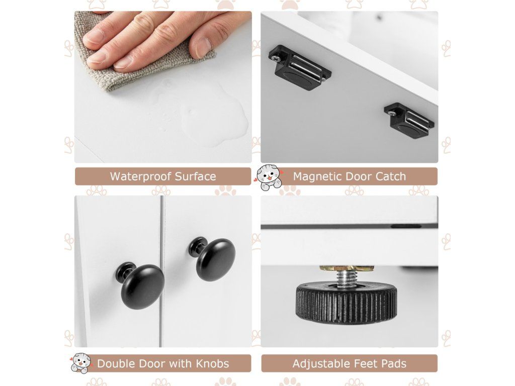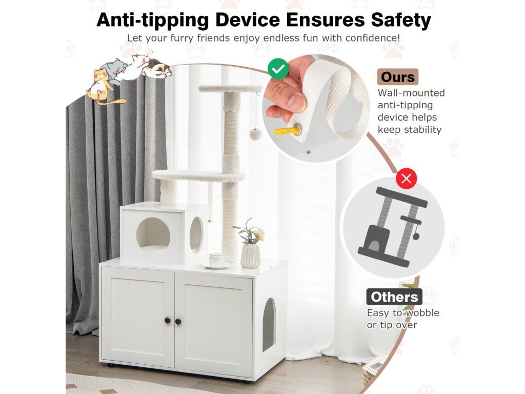 -Deluxe cat condo with soft cushion provides upgrade coziness-Hidden cat washroom is great to hide cat litter box-Multiple large entries are designed to provide easy access for cats-6.5" natural sisal scratching posts will save your furniture from sharp paws-Hanging teasing ball and jump platform offer endless fun-All-in-1 design allows cats to rest, play and poop in an ideal space-Included anti-tipping device ensures safety-Adjustable feet pads keep the cat tree stable on uneven grounds-Magnetic door catch enables the door to be closed firmly-Double door with knobs is easy to open and close-Waterproof surface is easy to maintain with a wet clothBuďte první, kdo napíše příspěvek k této položce.