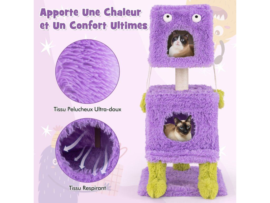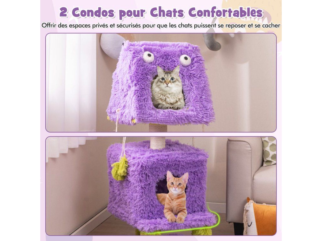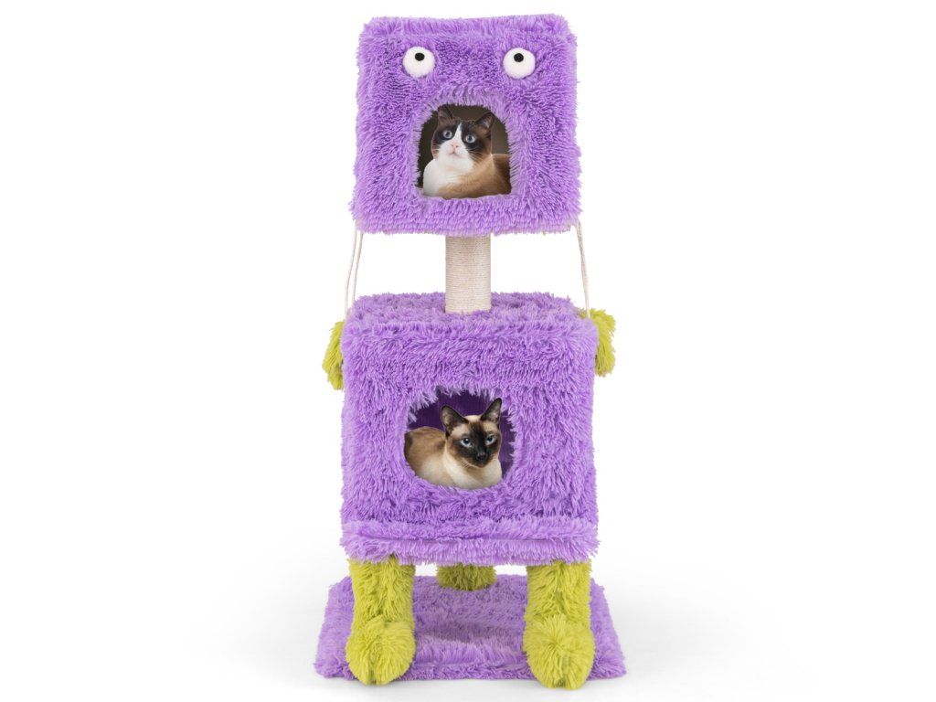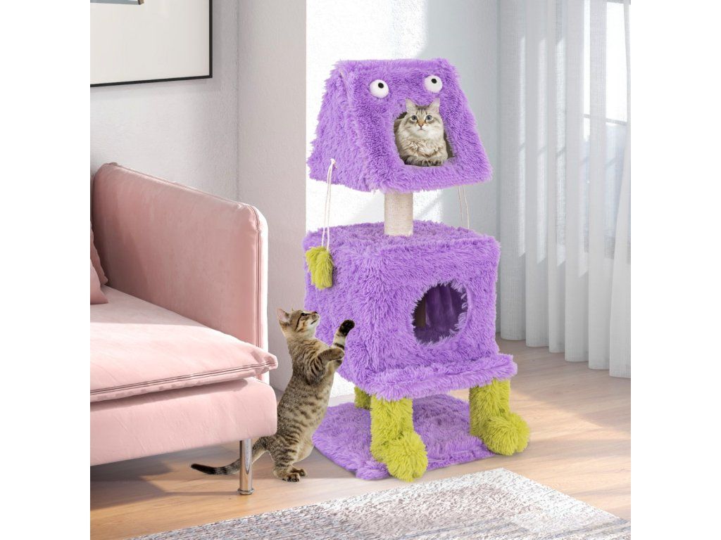 Cute Monster-Themed Cat Tower with 2 Private Condos and Soft Long Plush-Purple