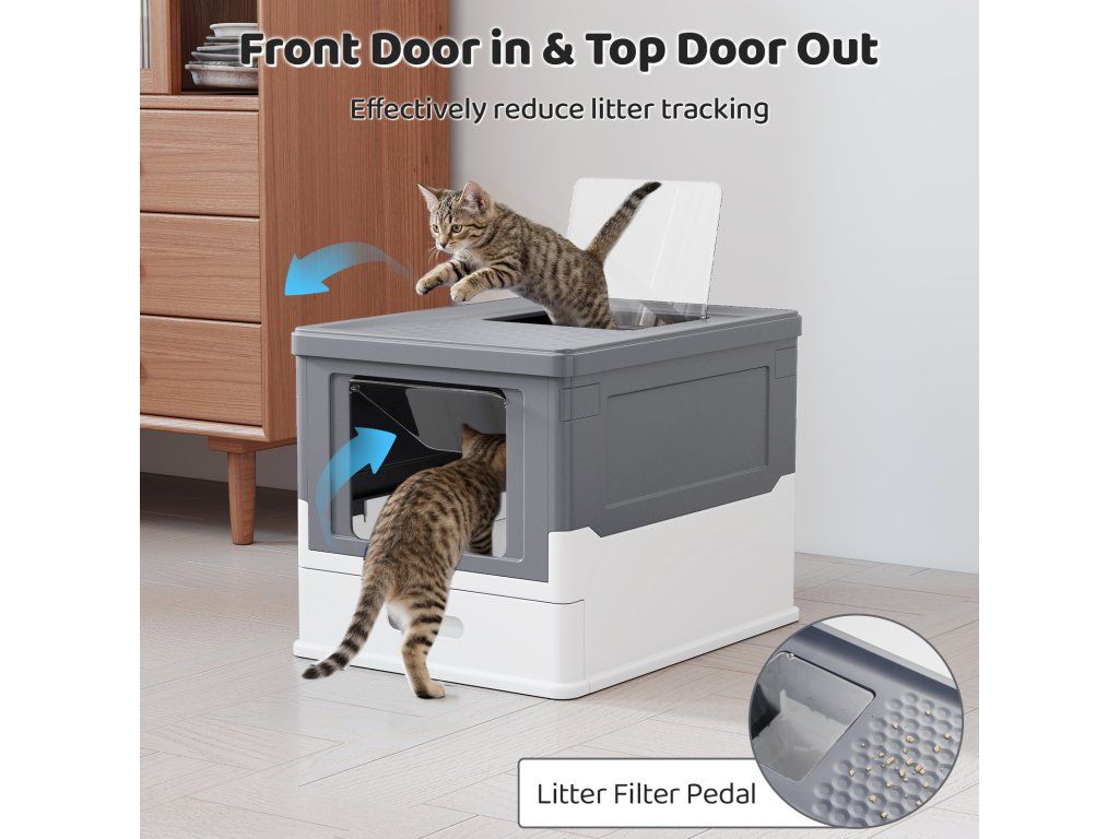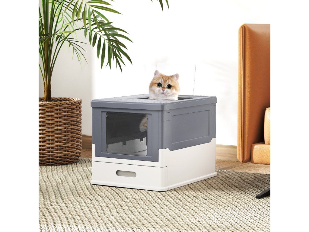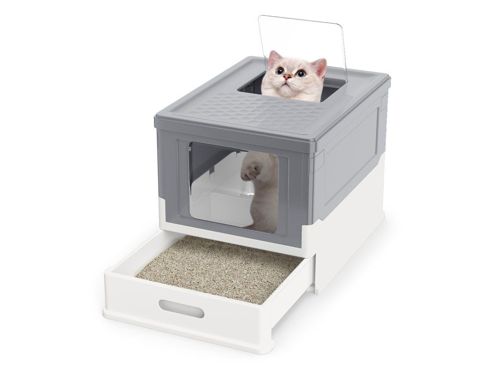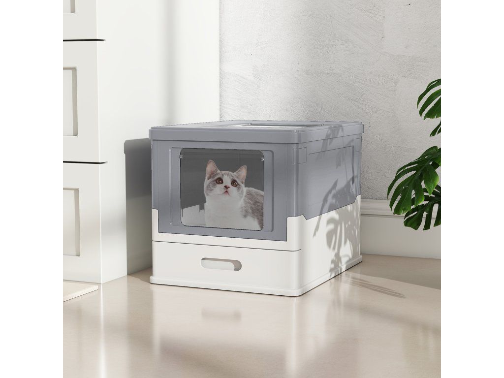 Optimize your pet care with this foldable, enclosed litter box. Designed for modern living, this lightweight litter box folds flat with minimal effort, making it ideal for easy storage, travel, or smaller apartments. The pull-out drawer ensures convenient refilling and cleaning. The spacious interior layout provides ample room for kittens and medium-sized cats. The innovative dual-entrance system allows your pet easy access and significantly reduces litter on floors, keeping your rooms cleaner. Popular with curious cats, the covered litter box combines privacy with ease of use. The fully enclosed design with a secure lid effectively contains odors. Characteristics: Drawer-like compartment with a practical handle that is very easy to clean. Front entrance and hinged lid as an exit effectively reduces debris being stirred up. Fully enclosed design for odor control Integrated scatter filter pedal prevents messy floors Suitable for kittens and medium-sized cats Space-saving, foldable design allows for compact storage Equipped with a transparent door window for easy observation Non-slip feet protect the floor. Tool-free, easy assemblyBuďte první, kdo napíše příspěvek k této položce.