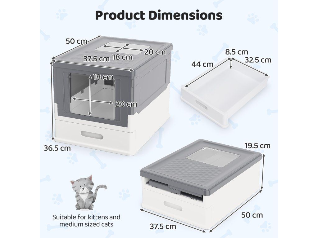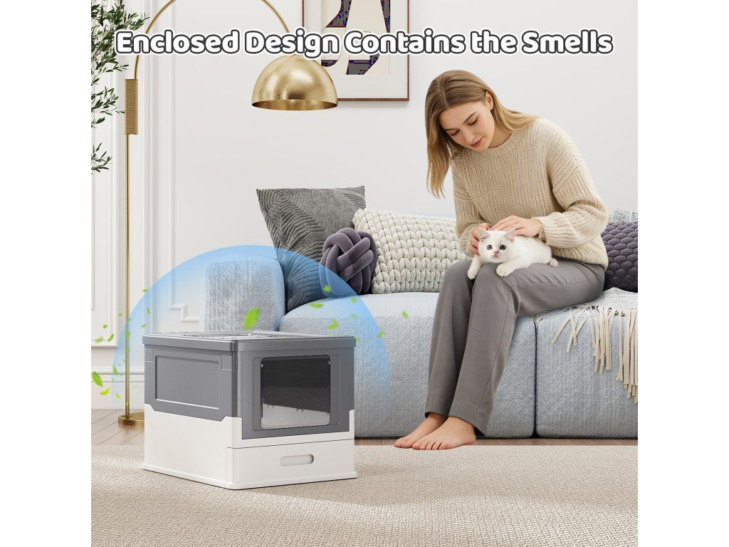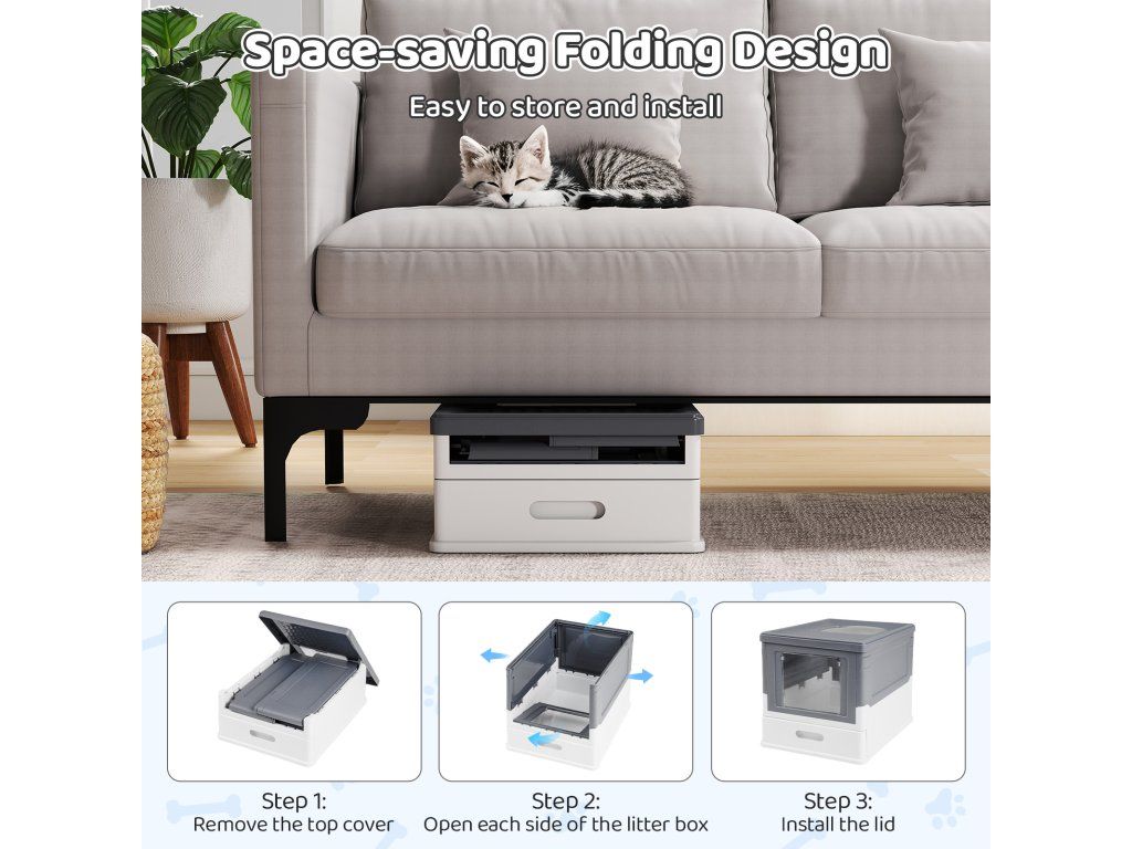 Foldable cat litter box with lid, extendable tray, and front entry, grey