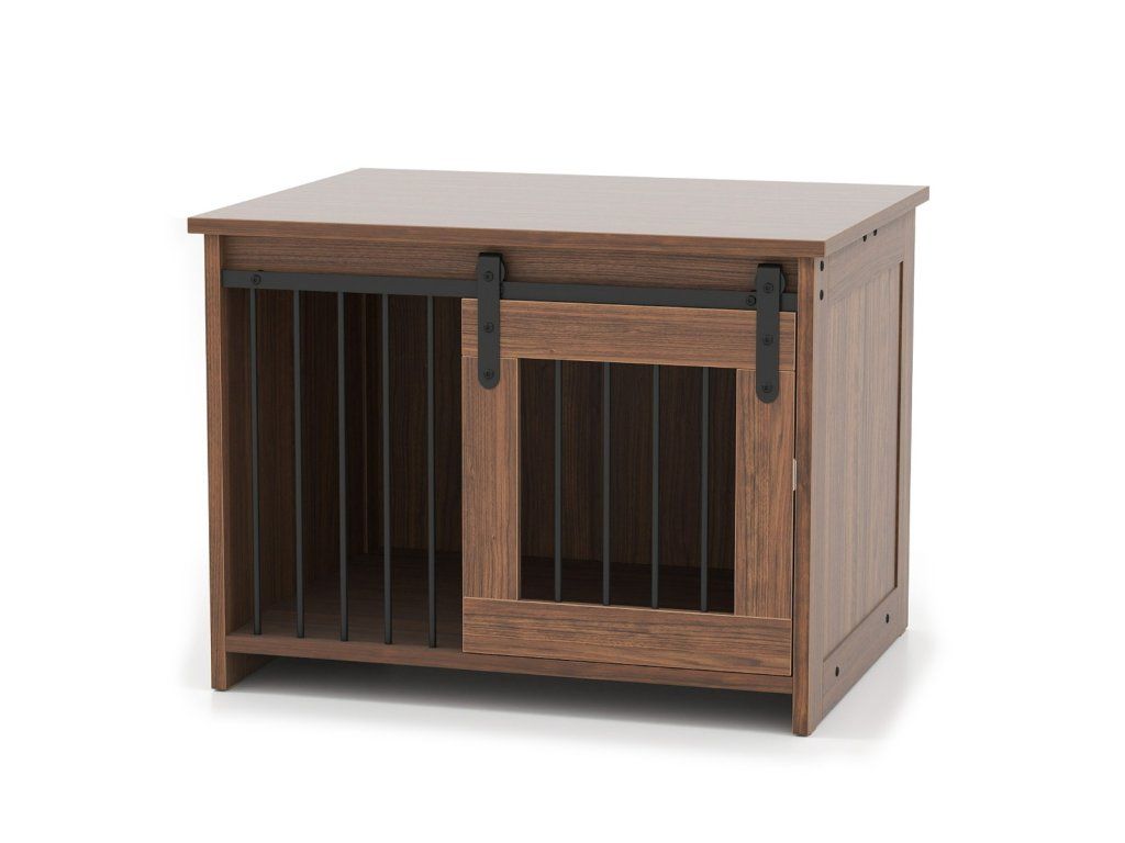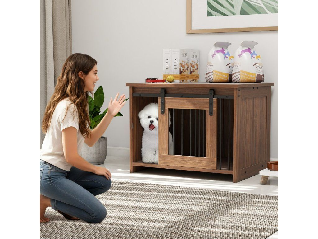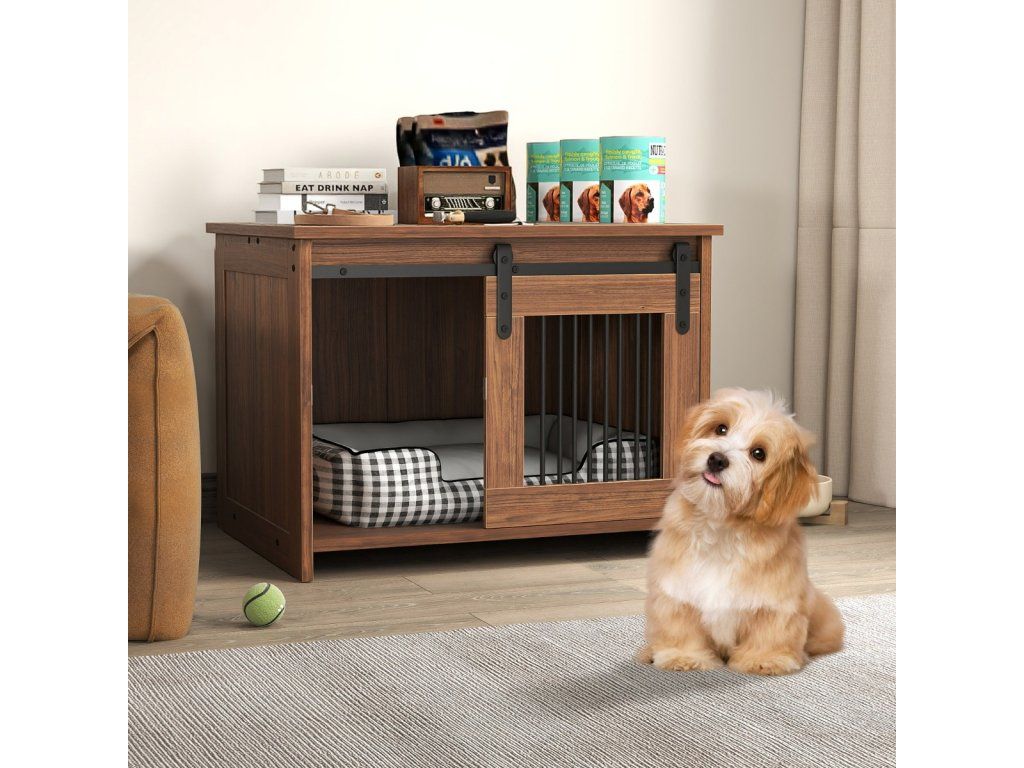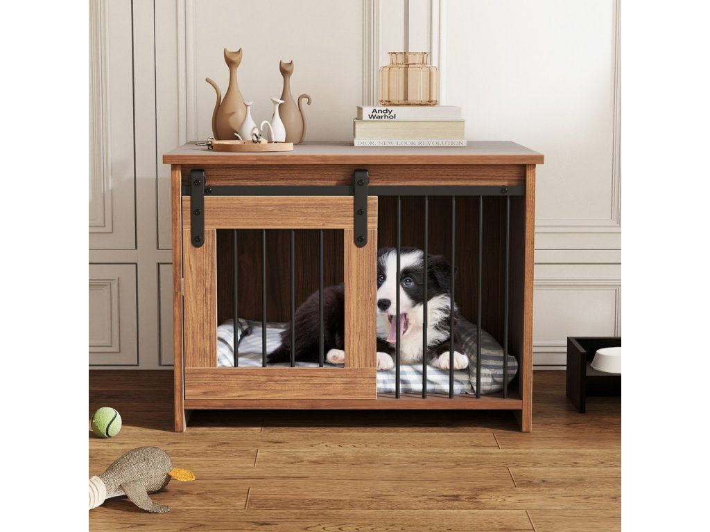 Modern Wooden Dog Crate with Large Tray, Sliding Door, Bite-Resistant Metal Tubes, Brown