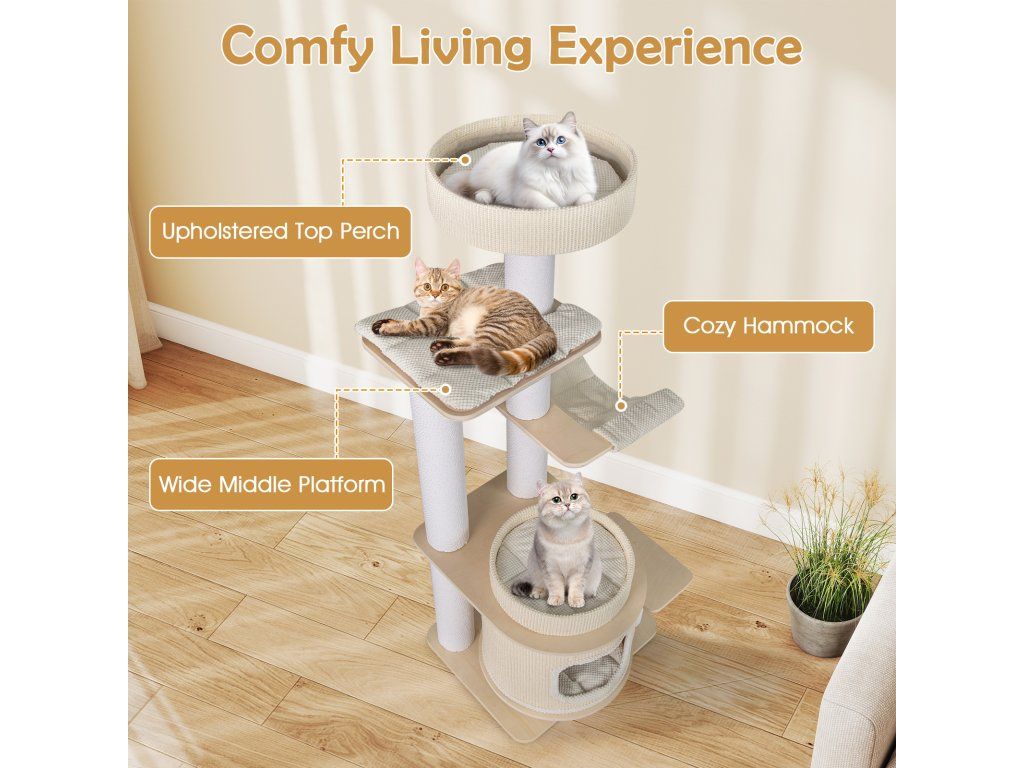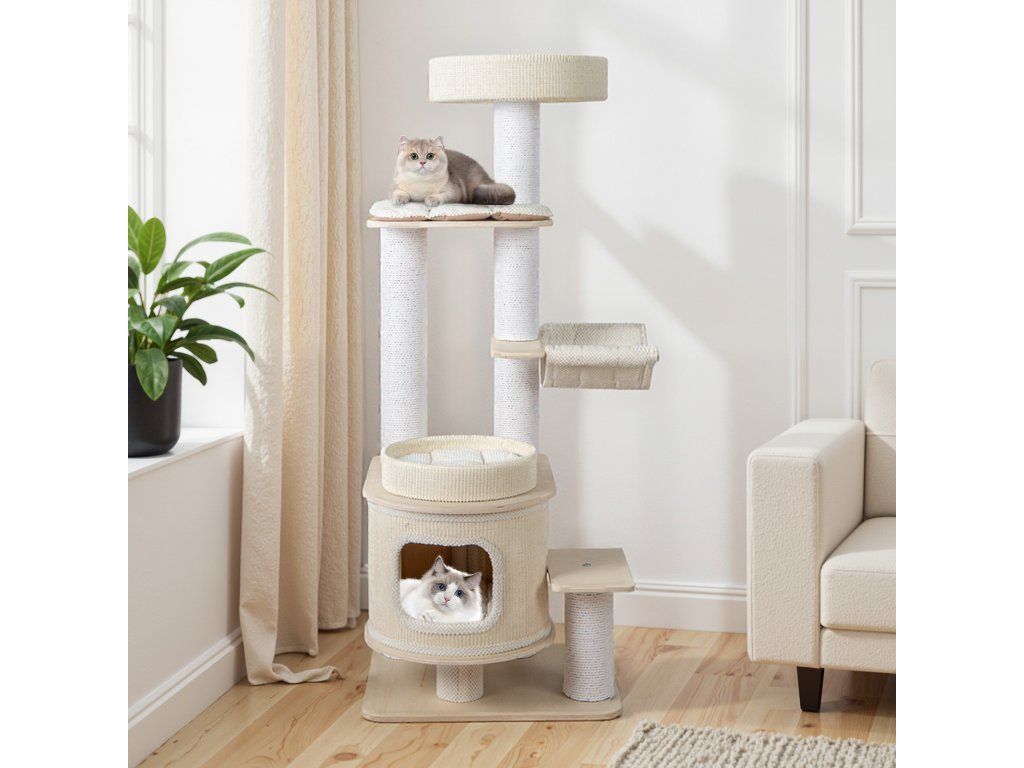 Moderní škrabadlo pro kočky 151 cm s houpací sítí, boudinkou a polstrovaným pelíškem - bílá
