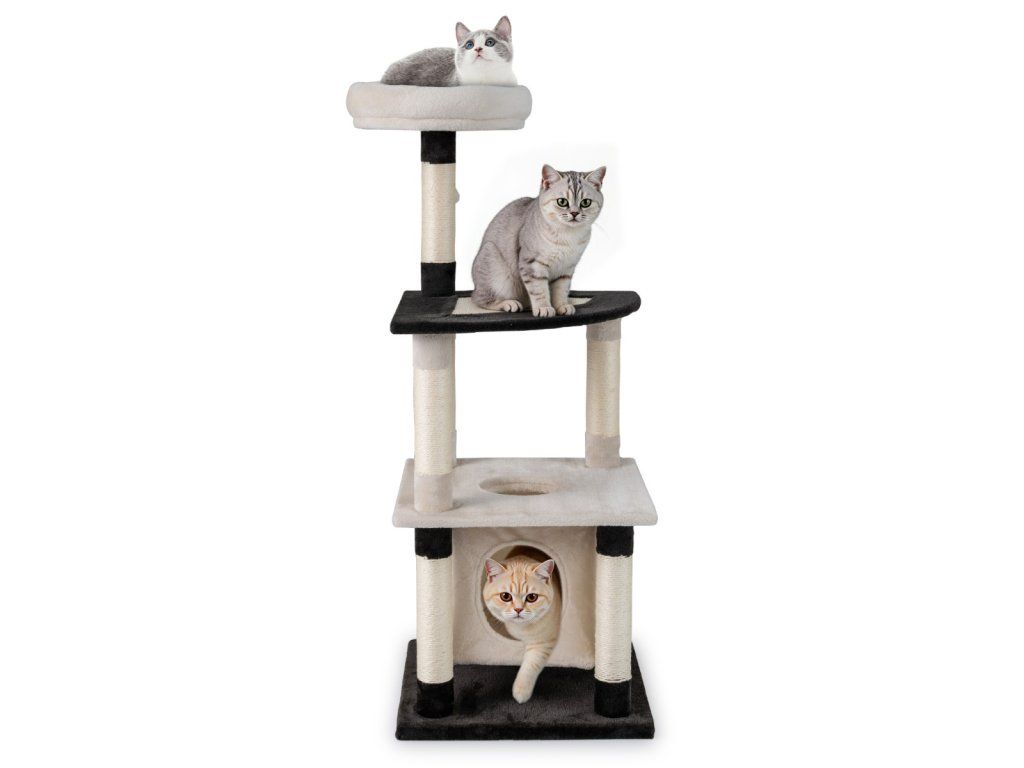Looking for the perfect cat tree for your feline friends? This modern cat tree, wrapped in soft fabric, offers exceptional comfort for your cats. Its arched platform and two-tone black and beige design create a peaceful haven for your companions. Made of sturdy and durable natural sisal hemp, it allows cats to easily sharpen their claws while protecting your furniture with its scratching panel. This versatile tower features a comfortable top perch and a private condo where your cat can relax, play, and sleep undisturbed. Equipped with a hanging ball for entertainment and holes for easy movement between levels, the tower provides a fun and practical environment. Its wide base and robust structure ensure optimal stability and a safe place where your feline friends will love to spend time. Attributes: 【Dream Paradise for Cats】This modern cat tree is covered in soft fabric to provide optimal comfort for your cats. The arched platform and black and beige color scheme make it a true paradise for your adorable companions. 【Satisfying Cats' Scratching Instinct】Made of natural sisal hemp, this scratching post is sturdy and wear-resistant, allowing cats to easily sharpen their claws. Furthermore, the scratching board satisfies cats' natural scratching instincts while protecting your furniture. 【Comfortable Living Space】Featuring a padded top perch, this versatile tower offers multiple comfortable spots for your feline friend to relax and play. It also includes a private condo so your cat can enjoy a peaceful and undisturbed sleep. 【Practical Designs】This multi-level kitten tower features a hanging ball for added fun. Additionally, convenient cat holes allow for easy movement between the different platforms. 【Stable and Secure Structure】With a wide base and sturdy construction, this modern cat tree provides a stable and safe environment, ideal for your feline friends to enjoy their new play space. Furthermore, the rounded corners reduce the risk of injury during playtime.Buďte první, kdo napíše příspěvek k této položce.