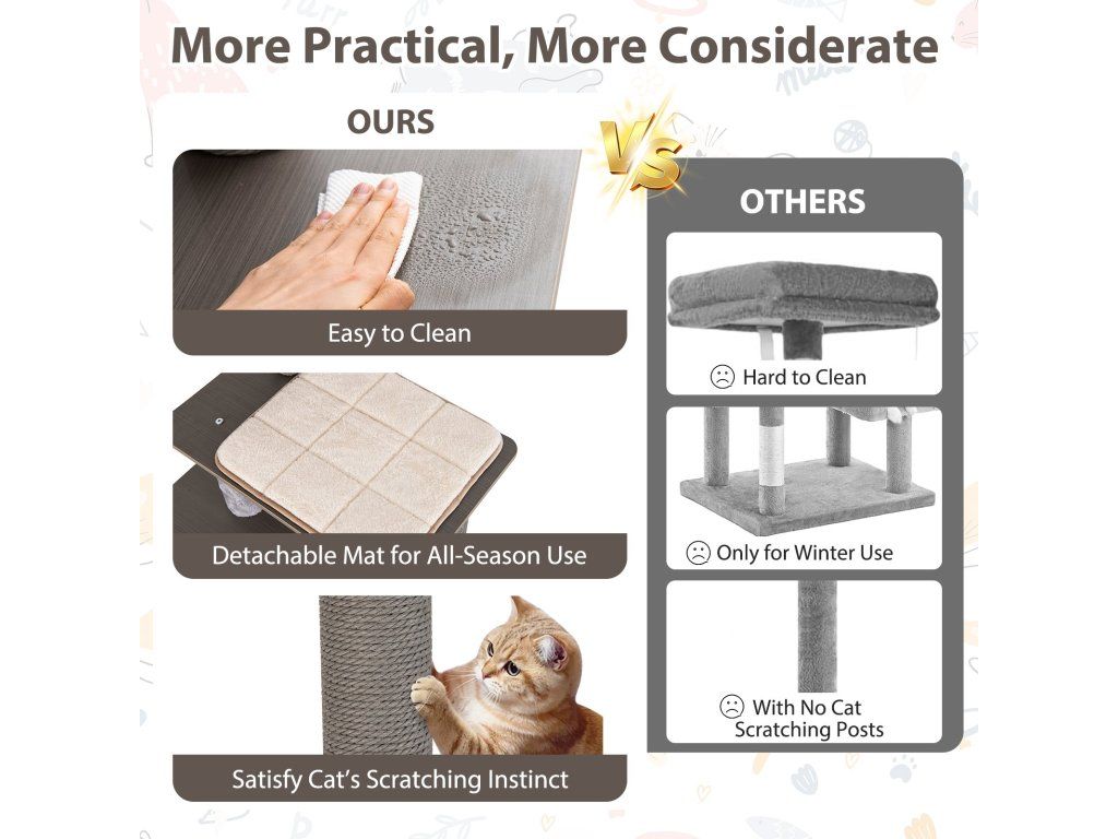 Our multi-level cat furniture is the perfect solution for your feline! This spacious, fence-style cat tree provides a cozy haven for lounging and hiding, while the wide top perch, with thick sponge padding, offers a luxurious space for relaxing and observing. Designed for easy maintenance, the removable cushions are ideal for any season, and the smooth top surface ensures easy cleaning. With 6 levels for climbing and exploring, this compact cat tree maximizes vertical space while fitting neatly into every nook and cranny, making it perfect for small apartments. Additionally, the sturdy scratching posts promote paw care, and the playful hanging pompom with its bell satisfies your cat's natural instincts: to scratch, stretch, and hunt. Give your cat the perfect balance of comfort, fun, and practicality with this thoughtfully designed cat furniture! Attributes: 【Large Fence Style Cat House】Measuring 43.2cm x 28cm x 28cm (L x W x H), this square cat house provides generous space for your cat to relax and hide. Its stylish fence-style design adds a modern and elegant touch to your room. In addition, the soft interior cushion provides your cat with a cozy space. 【Comfortable Top Perch】This large cat house features a wide top platform, ideal for relaxing, observing, or sunbathing. The thick sponge padding and skin-friendly fabric provide a soft touch. In addition, the top cushion is removable and machine washable. 【Stable Multi-Level Cat Tree】Featuring 6 levels, this furniture encourages natural climbing and exploration, providing your cat with endless fun. In addition, the thick top and sturdy support posts allow your cat to climb and play safely between the different platforms. 【Scratching Posts & Hanging Tassel】The sturdy scratching posts are perfect for scratching and shedding claws, promoting good health. Paw care. In addition, the included hanging tassel with bell adds a playful touch and satisfies the cat's hunting instinct. 【Easy Maintenance】This modern cat climbing frame features removable cushions for summer and winter use. The removable mats and smooth surface of the deck also make maintenance easy.Buďte první, kdo napíše příspěvek k této položce.