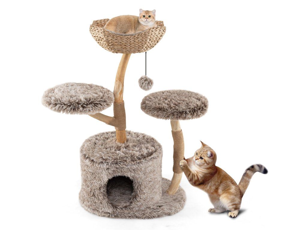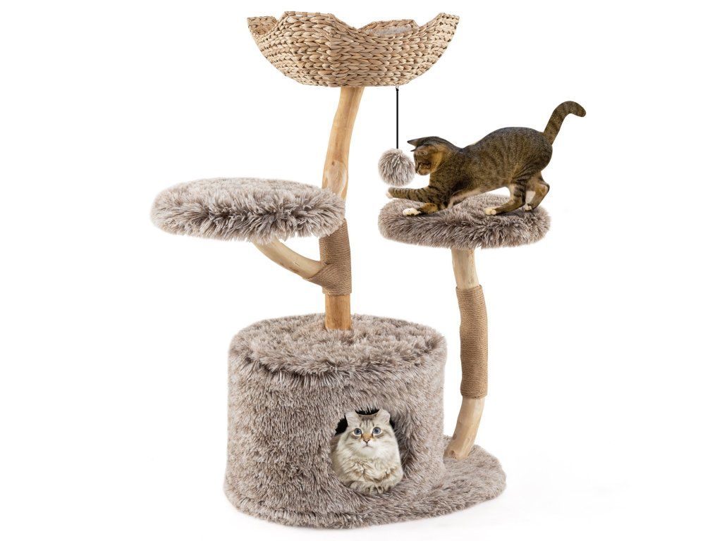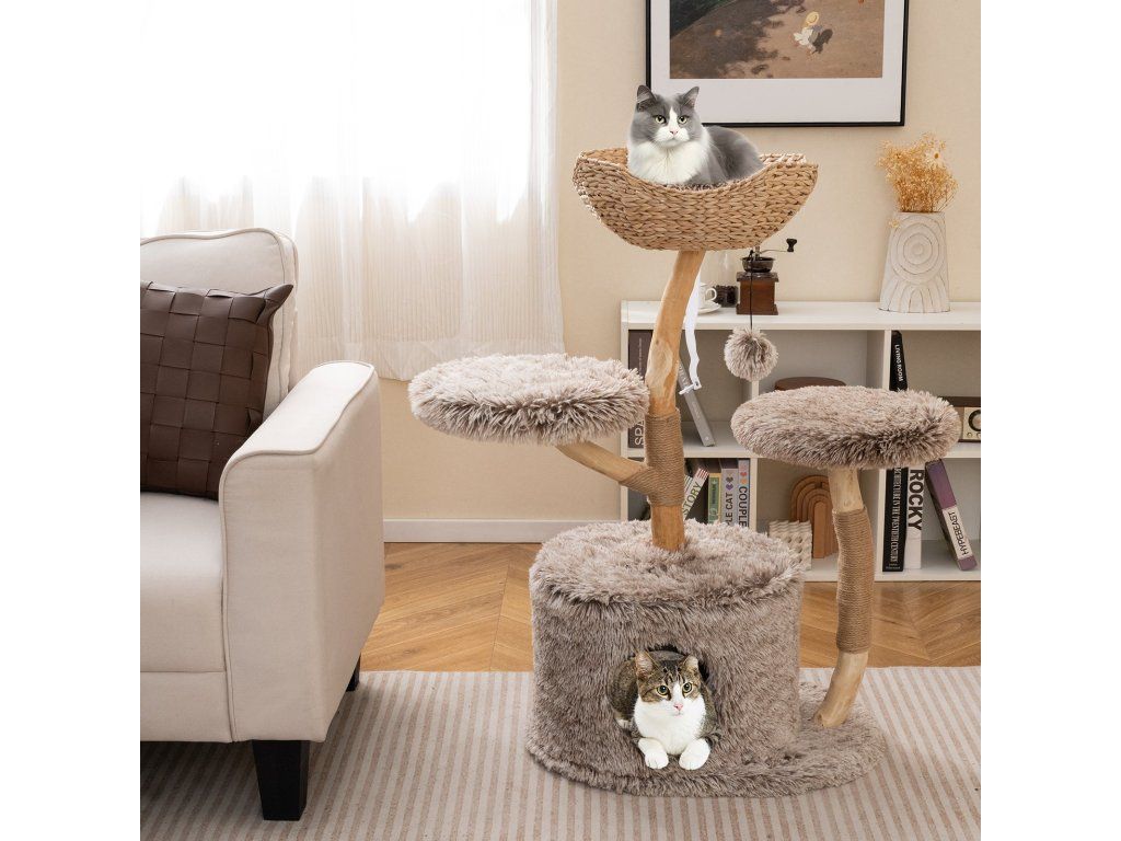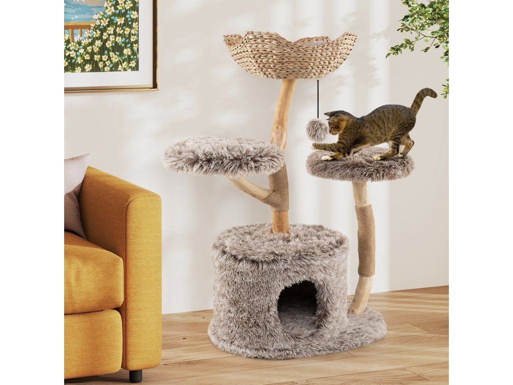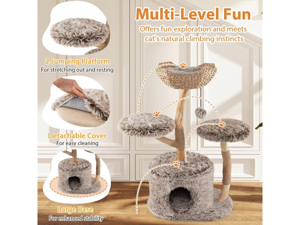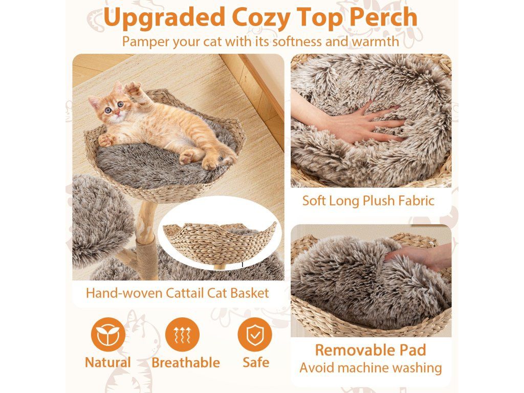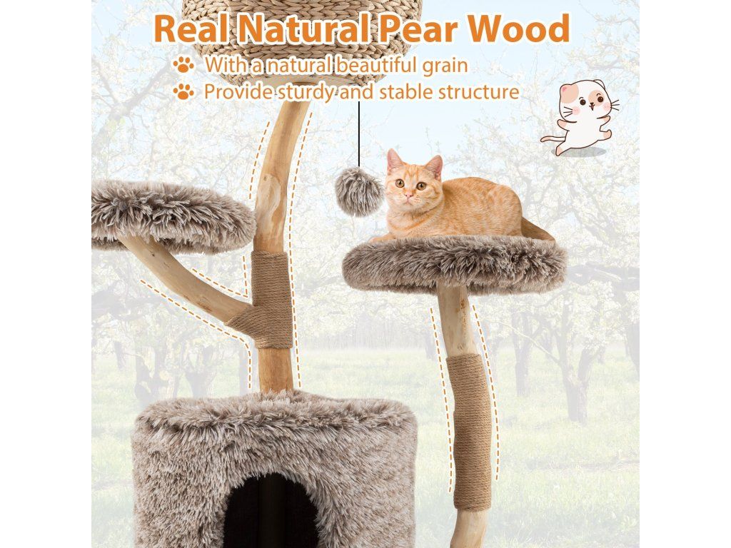 This modern wooden cat tower features multiple levels for climbing and exploring, a cozy top perch, and a spacious cat condo for resting. With sturdy scratching posts and a hanging plush ball, your cat will stay physically active and mentally engaged. The large base ensures reliable stability, while the removable plush covers make for easy maintenance. Treat your feline friend to luxury and style with our multi-level cat tree. Bullet Point:Natural Pear Wood Craftsmanship: Embrace the durability and natural elegance with our cat tree crafted from natural pear wood. Each piece features distinct wooden grains, making every modern wooden cat tower not only a playground but a piece of art in your home. Cat Activity and Rest Center: This multi-level cat tree features 2 soft jumping platforms and a cozy top perch made of the hand-woven cattail basket, catering to your cat's natural instincts for climbing and exploring. It also includes a large cat condo, providing your feline friend with a private and secure place to rest. Engaging Scratching and Playing Options: Designed keeping in mind your cat’s instinctual need, this cat tree tower includes sturdy natural jute scratching posts and a playful plush hanging ball. These features help maintain your cat's physical health and mental well-being by encouraging a lot of jumping, scratching, and playing. Enhanced Stability and Security: Stability at its core, the large base of our pet furniture prevents any wobbling or tipping, ensuring your cat enjoys their climbing without any risks. The included anti-tip kit provides an extra layer of security, making this luxury cat condo safe for energetic felines. Easy Maintenance: The plush covers on the 2 jumping platforms can be easily removed for convenient cleaning, ensuring a hygienic environment for your beloved cat. The plush cushion of the top basket bed can also be taken out for separate hand washing, ensuring your indoor pet furniture remains attractive and odor-free.Buďte první, kdo napíše příspěvek k této položce.