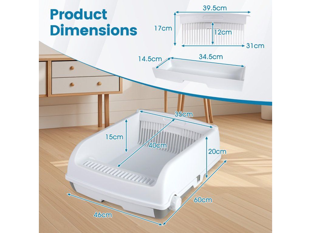 Improve your pet's daily care with the semi-automatic litter box. The semi-enclosed litter box, with its splash-proof high sides, ensures cleanliness and easy maintenance. The open design features a smooth-gliding tray and scoop for thorough filtration, eliminating dead spots. Simply turn the knobs to open the box for easy removal of waste. The pull-out design makes cleaning simple and effectively controls odors. Characteristics: The high, splash-proof rim keeps the floor clean. Leak-proof pedal reduces tracking of cat litter The smooth sliding rail design guarantees dust-free sand removal. The practical pull-out drawer makes cleaning easier. Easy removal of feces via a rotary knob for filtering the cat litter. Non-slip rubber feet protect the floor. Removable and washable for easy care Easy assembly and disassembly thanks to plug-in fastenersBuďte první, kdo napíše příspěvek k této položce.