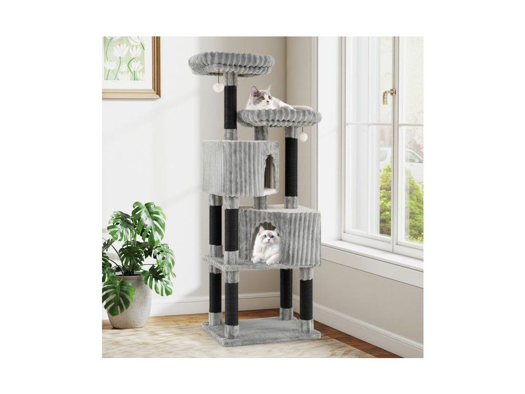 Škrabadlo ve výšce 156 cm v šedém provedení kombinuje elegantní design s promyšleným uspořádáním - výsledkem je místo, kde se vaše kočky budou cítit jako doma, a doplněk, který přirozeně doplní moderní interiér.