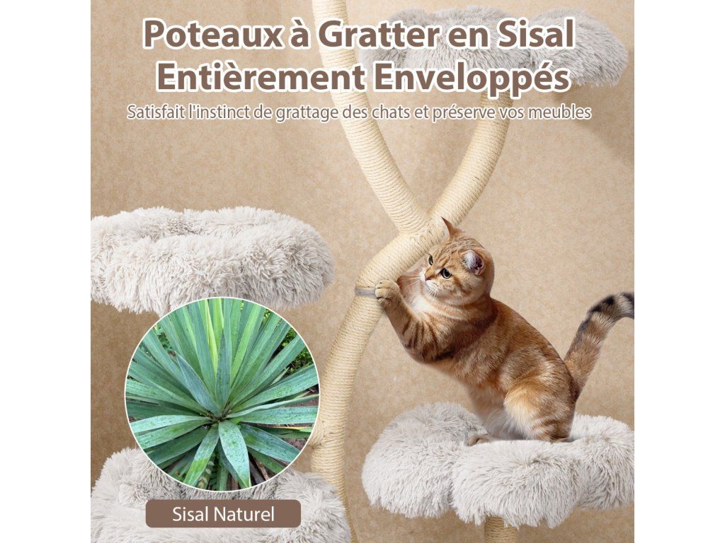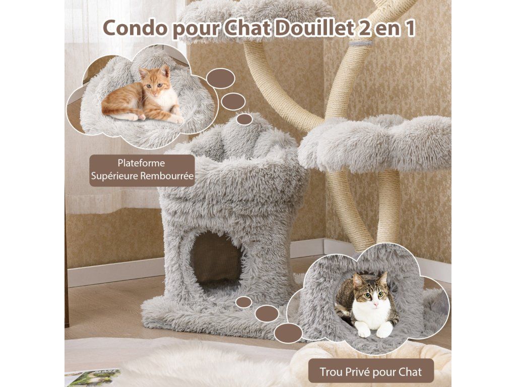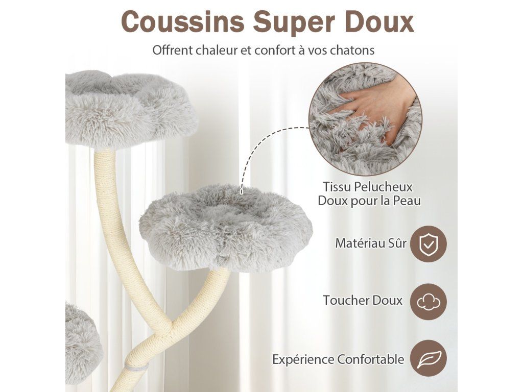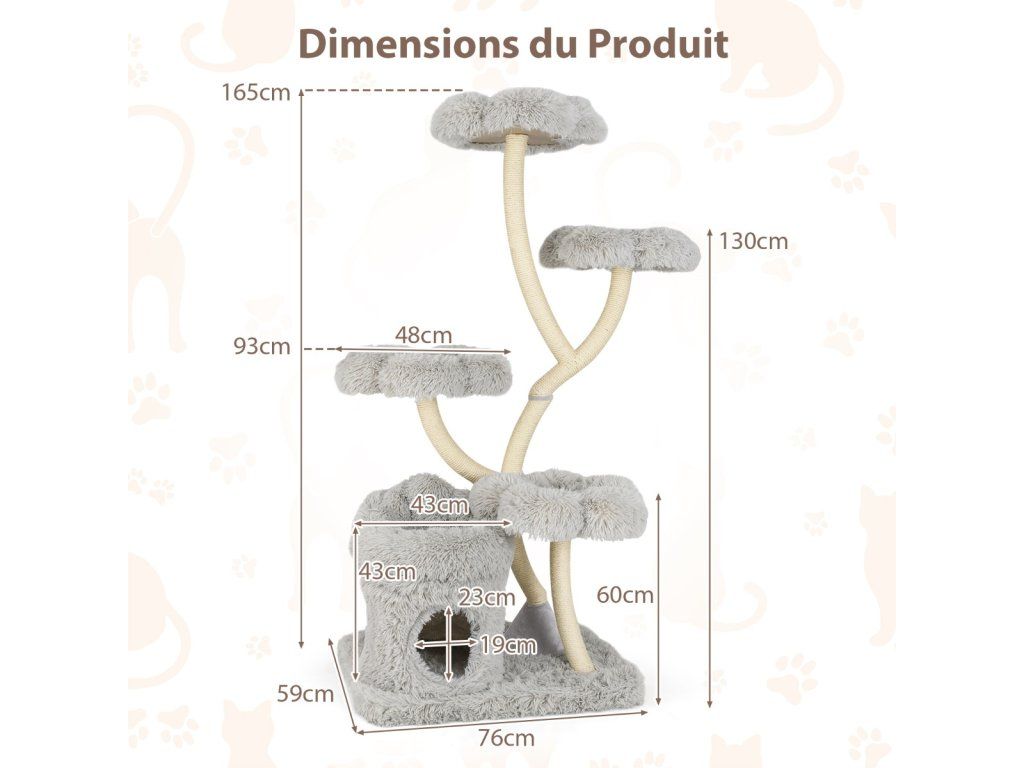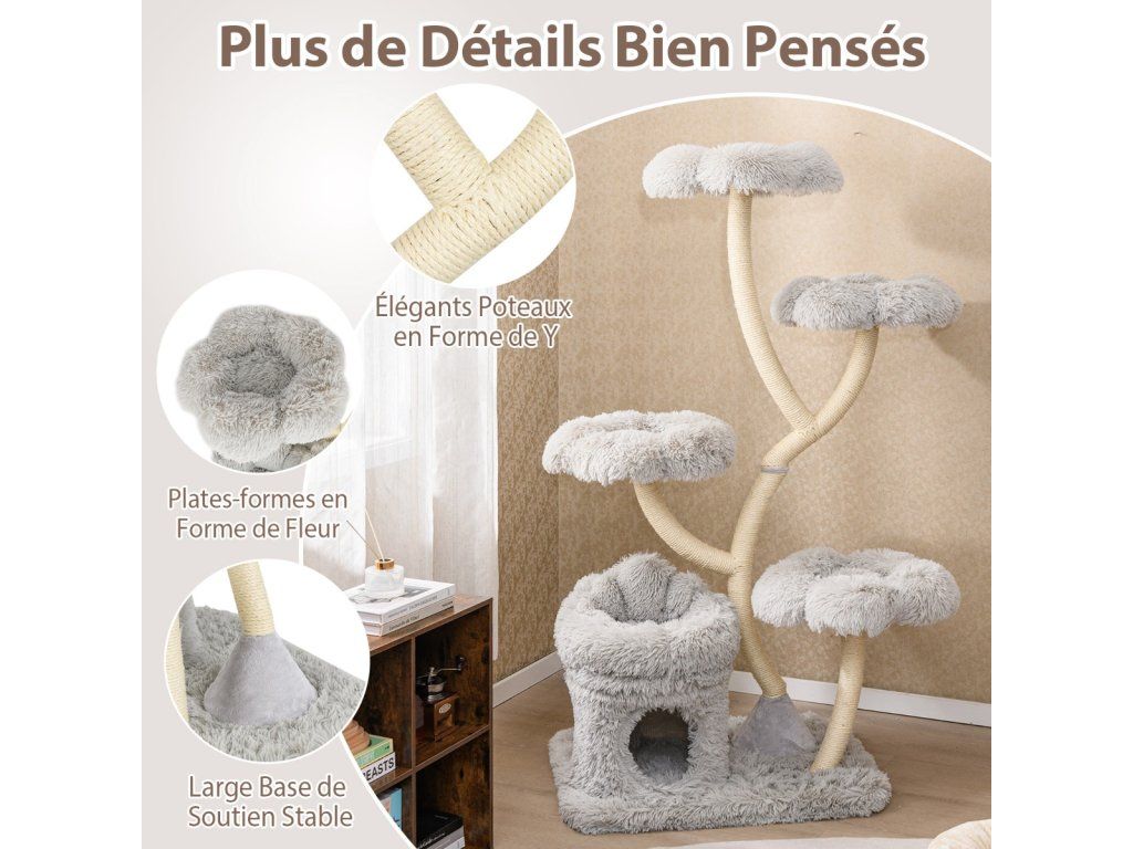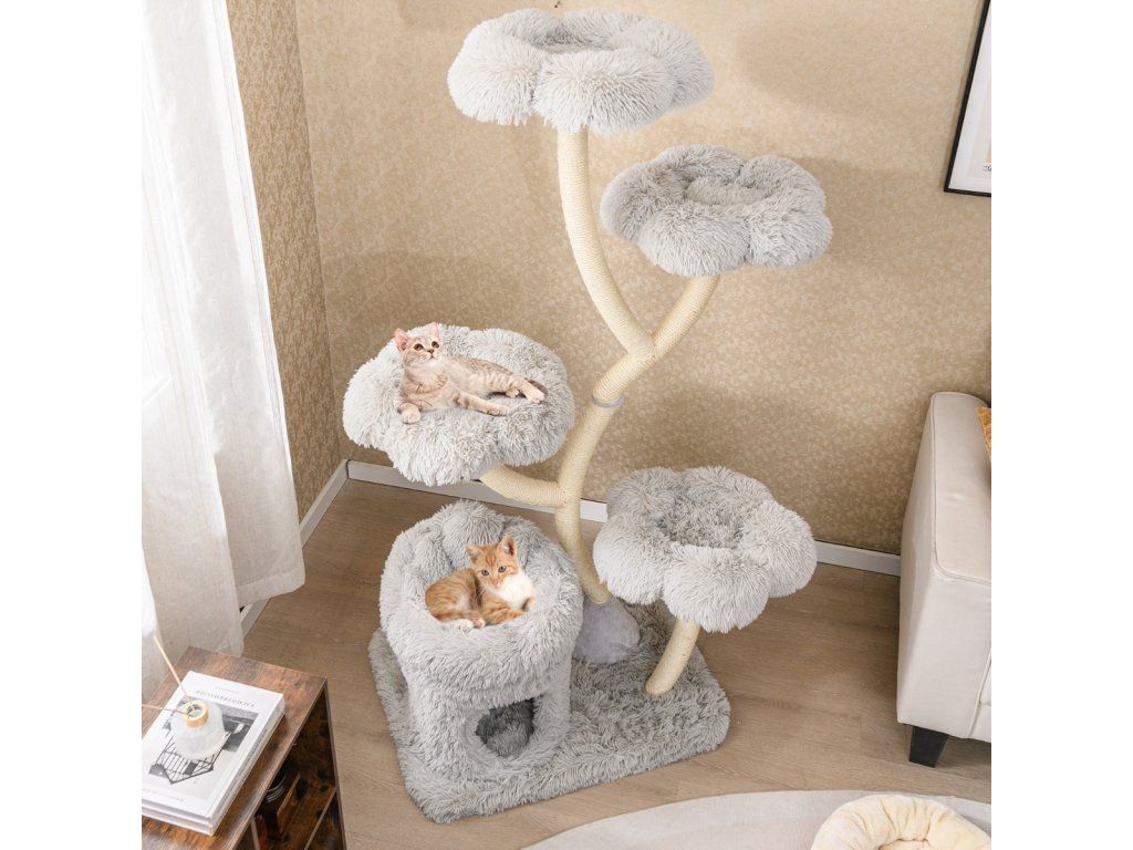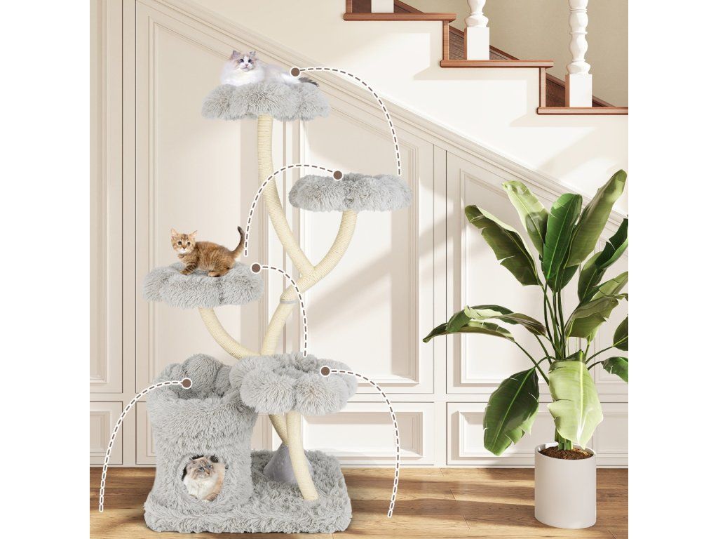 Škrabadlo pro kočky 165 cm s kočičí jeskyní, Y-sloupky a květinovými plošinami - šedá