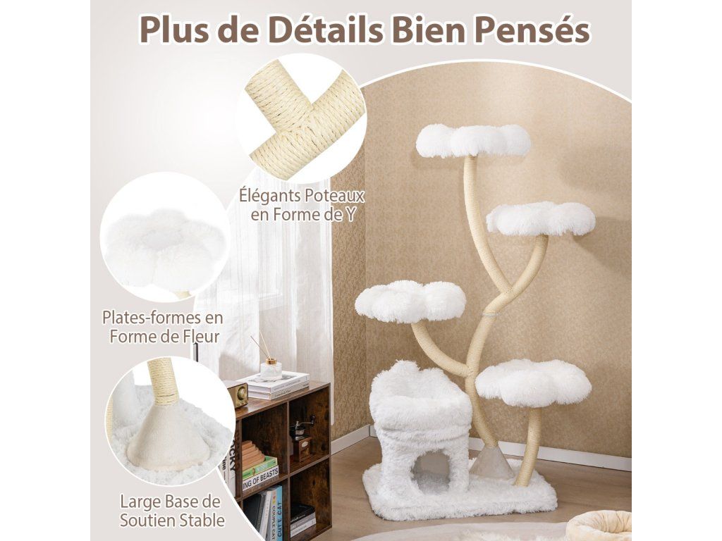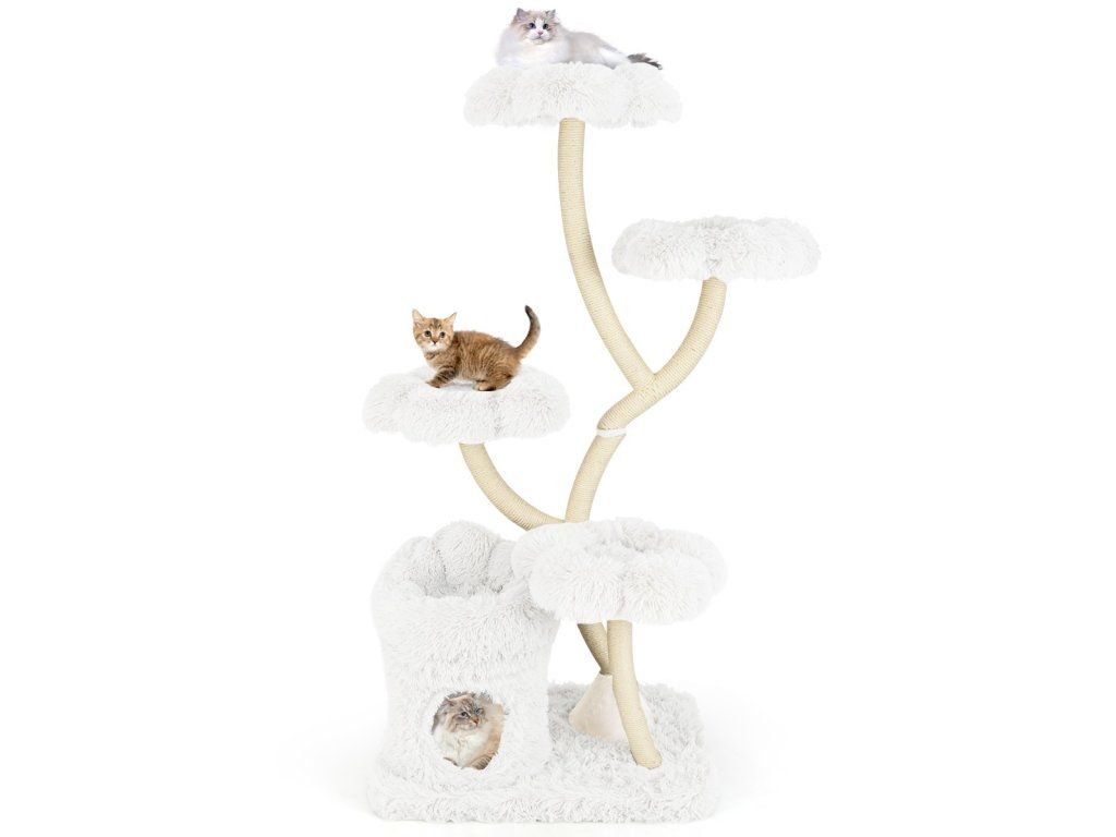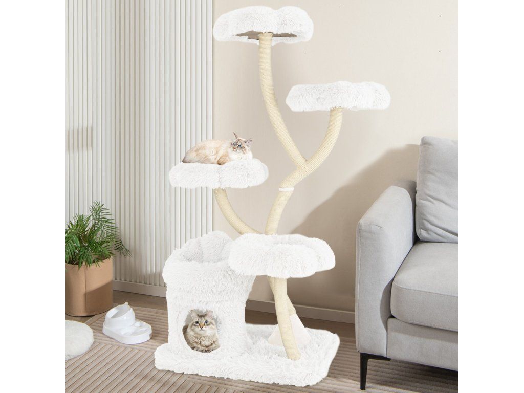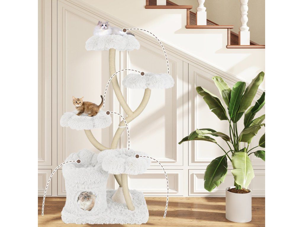 Škrabadlo pro kočky 165 cm s květinovou plošinou, 2v1 boudičkou a sisalovými sloupky - bílá