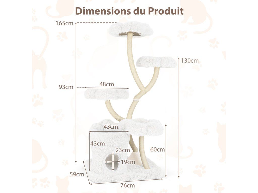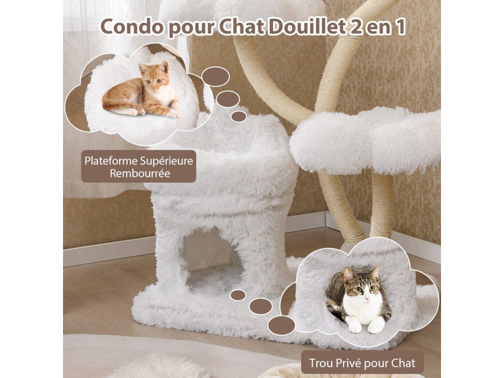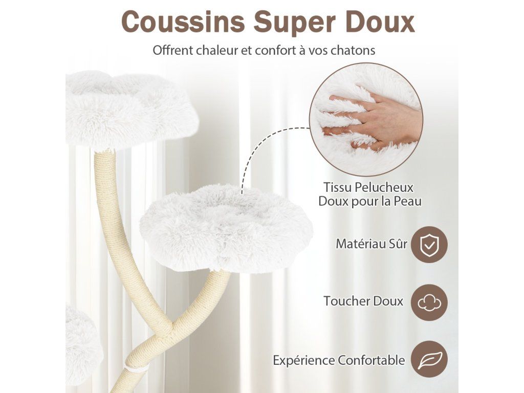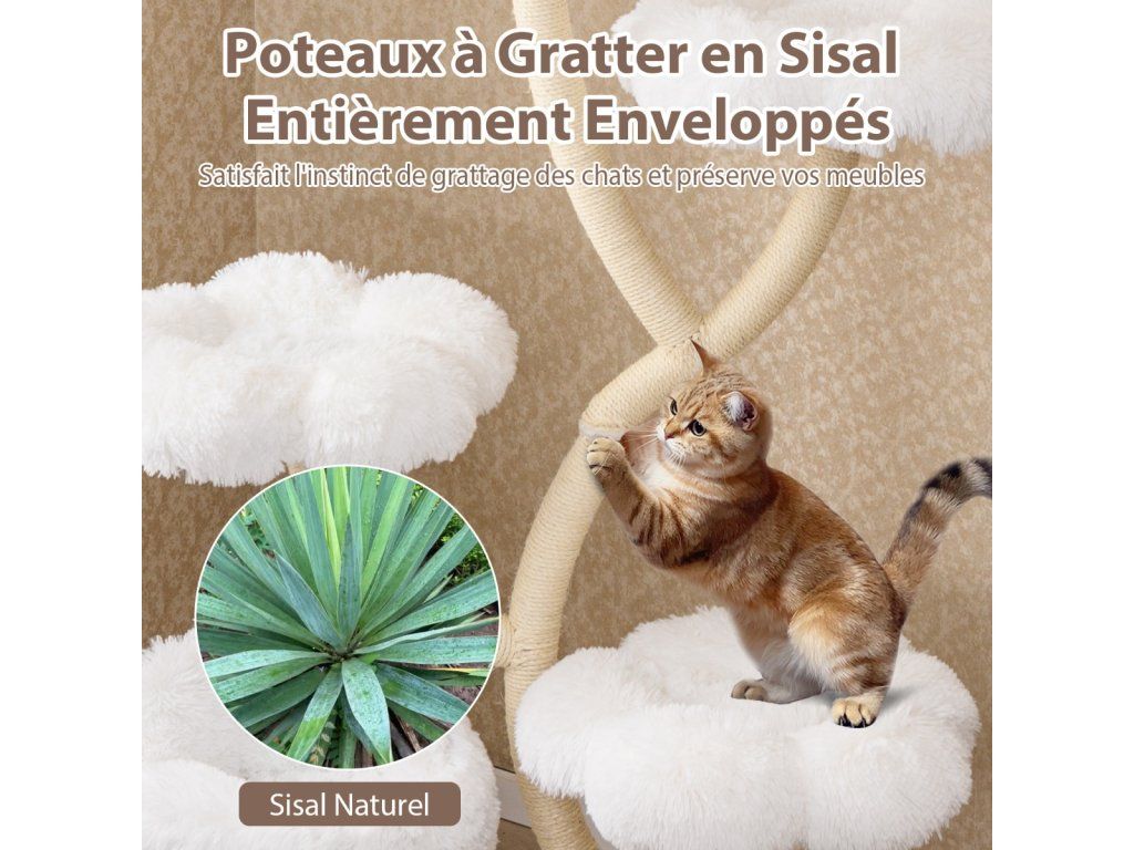 Škrabadlo pro kočky 165 cm s květinovou plošinou, 2v1 boudičkou a sisalovými sloupky - bílá