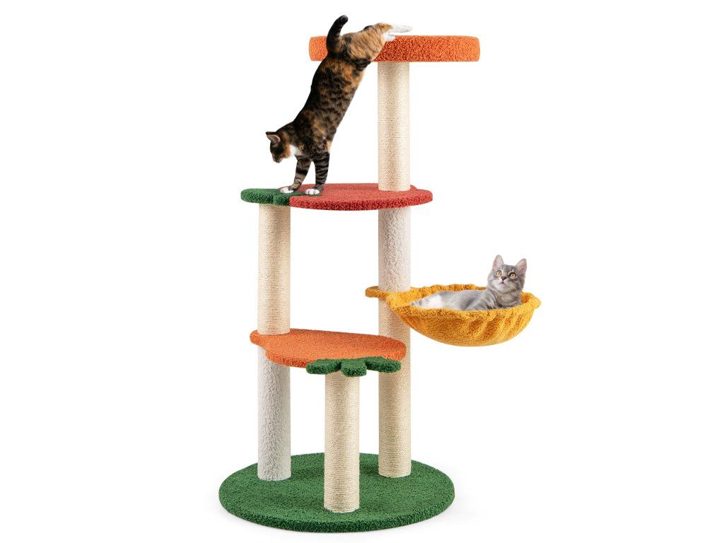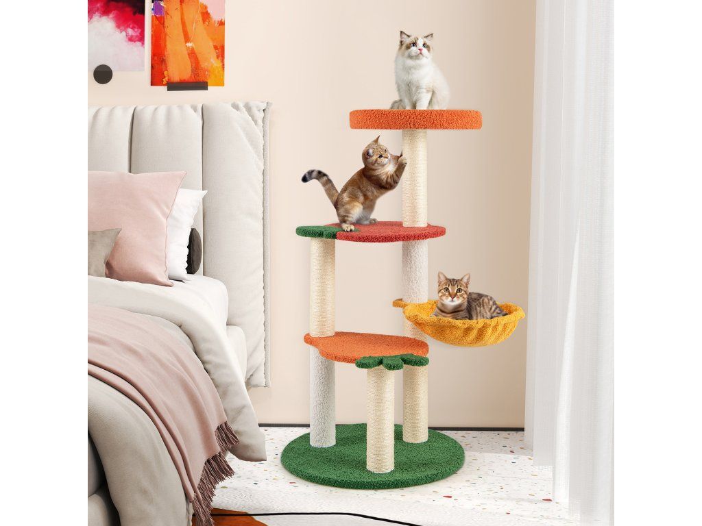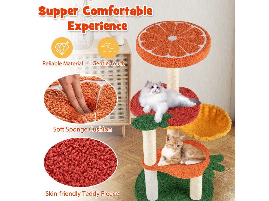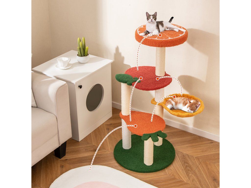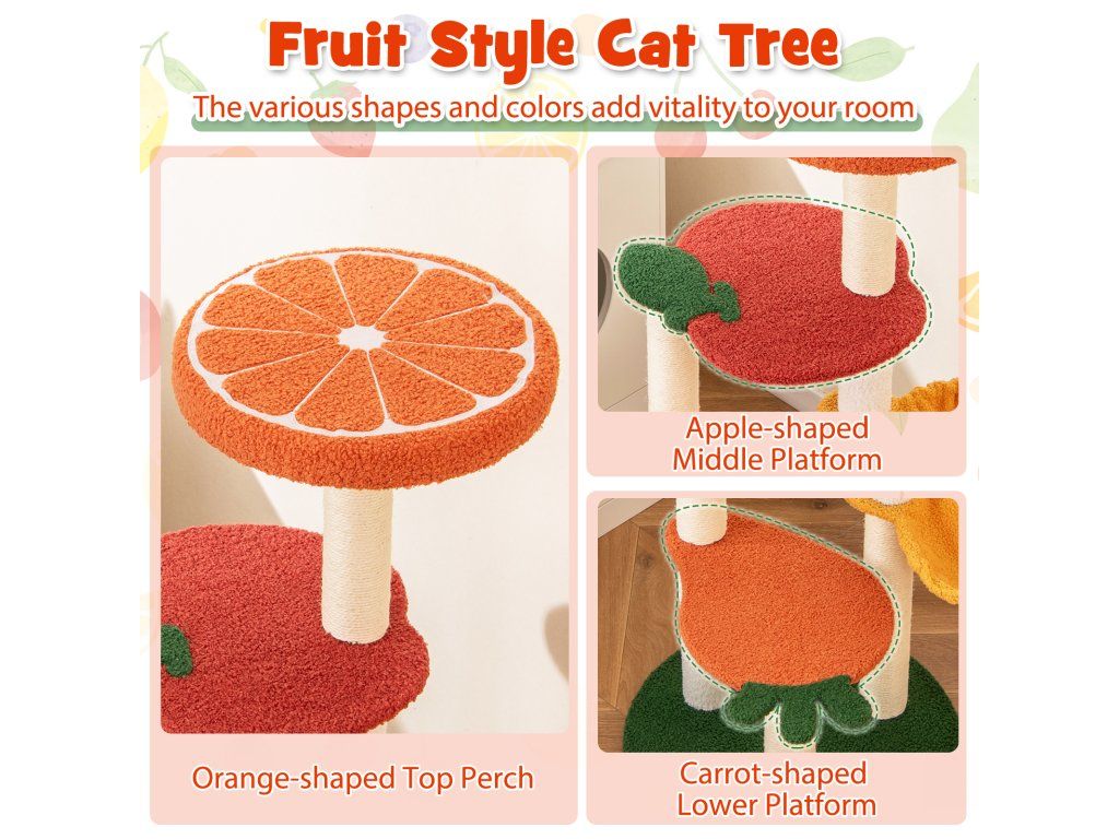 Our fruit-style cat tree is a vibrant and colorful addition to any home! Designed with a charming fruit theme, it features a carrot-shaped lower platform, an apple-shaped middle platform, and an orange upper resting area. The 48.5 cm wide round base provides a solid foundation that prevents the cat tree from tipping over, even when your cat climbs or jumps. Additionally, this cat activity center features a soft sponge pad on the orange upper resting area, providing your cat with a comfortable area to rest. The scratching posts are designed to satisfy your cat's natural scratching instincts while protecting your furniture. Attributes : Fruit-Style Cat Tree: This chic cat tree is a vibrant and colorful addition to any home. Designed with a charming fruit theme, it features a carrot-shaped lower platform, an apple-shaped middle platform, and an orange upper platform. The colorful and diverse design offers cats endless fun. Cozy & Rotatable Hammock: Equipped with a 31.5 cm wide hammock, this fruit-style cat tree provides your cat with a wonderful place to sleep. Furthermore, the hammock can be easily rotated to adapt to different configurations, allowing you to adjust it to your space or your cat's preferences. Super Comfortable Experience: The cat climbing furniture features a soft sponge pad on the orange upper resting area, providing a comfortable area for your cat to rest. Additionally, the skin-friendly teddy fleece fabric adds a soft touch for your feline companion. Practical scratching posts for cats: These scratching posts are designed to satisfy your cat's natural scratching instincts while protecting your furniture. These posts are wrapped in high-quality sisal material, providing a reliable and satisfying scratching surface for your cat. Robust & Stable Base: The 48.5 cm wide round base provides a solid foundation that prevents the cat tree from tipping over, even when your cat climbs or jumps. Furthermore, the reinforced pillars and solid screw connections ensure the overall stability of the structure. Characteristics : Charming fruit-themed design with carrot, apple, and orange platforms 48.5 cm wide round base prevents tipping during play Reinforced columns and fixed screws ensure stability Soft sponge pad on the upper berth for comfort Skin-friendly teddy fleece material offers a soft touch Premium sisal-wrapped scratching posts Equipped with a 31.5 cm wide rotating hammock for the perfect sleeping place Sturdy construction ensures peace and quiet while your cat plays and exploresBuďte první, kdo napíše příspěvek k této položce.