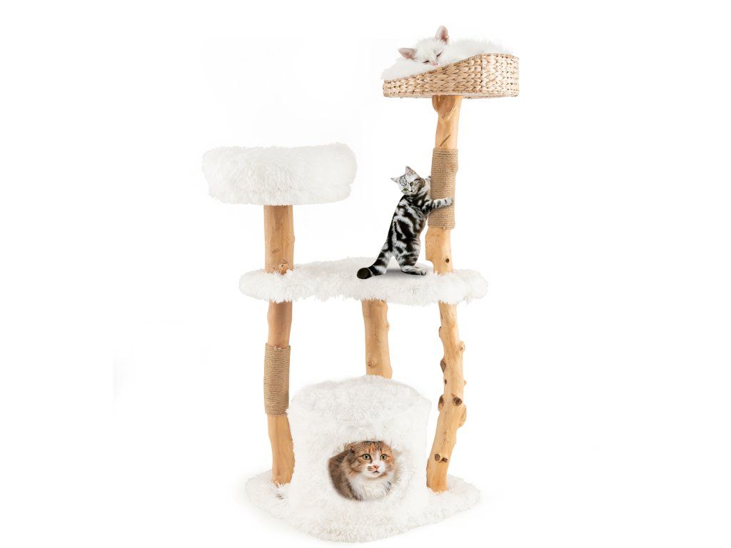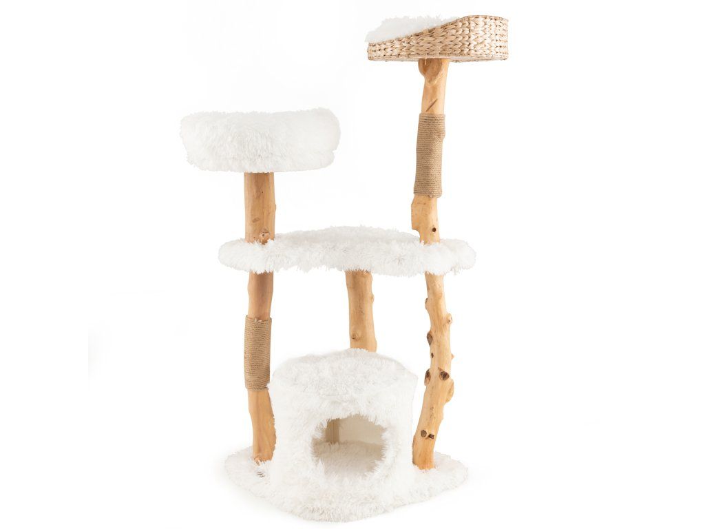 Solid Wood Cat Tower with Top Cattail Basket Cat Bed for Indoor Cats-White